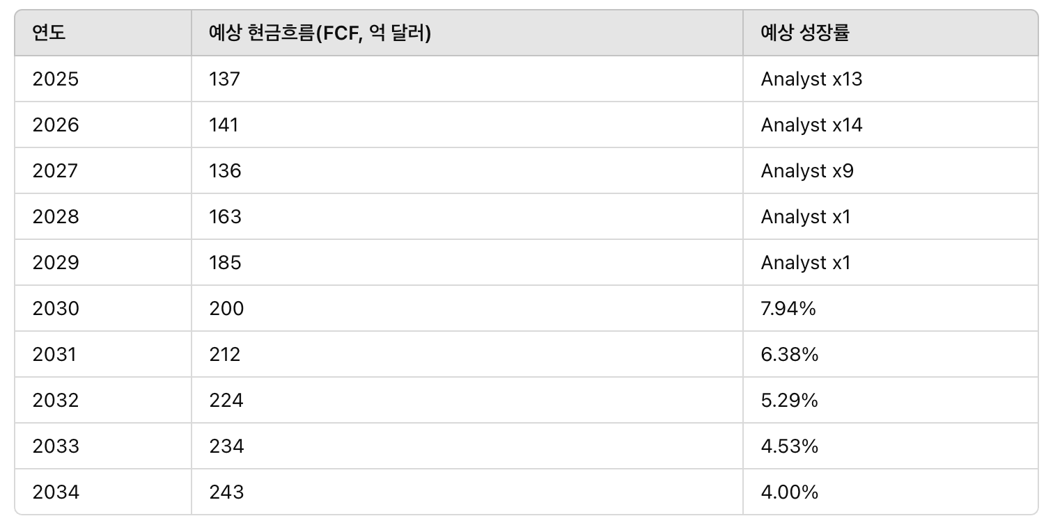위 데이터를 기반으로, 10년 동안의 예상 현금흐름을 8.5%의 할인율로 현재 가치로 환산한 결과, **1170억 달러(PVCF)**로 평가되었다.