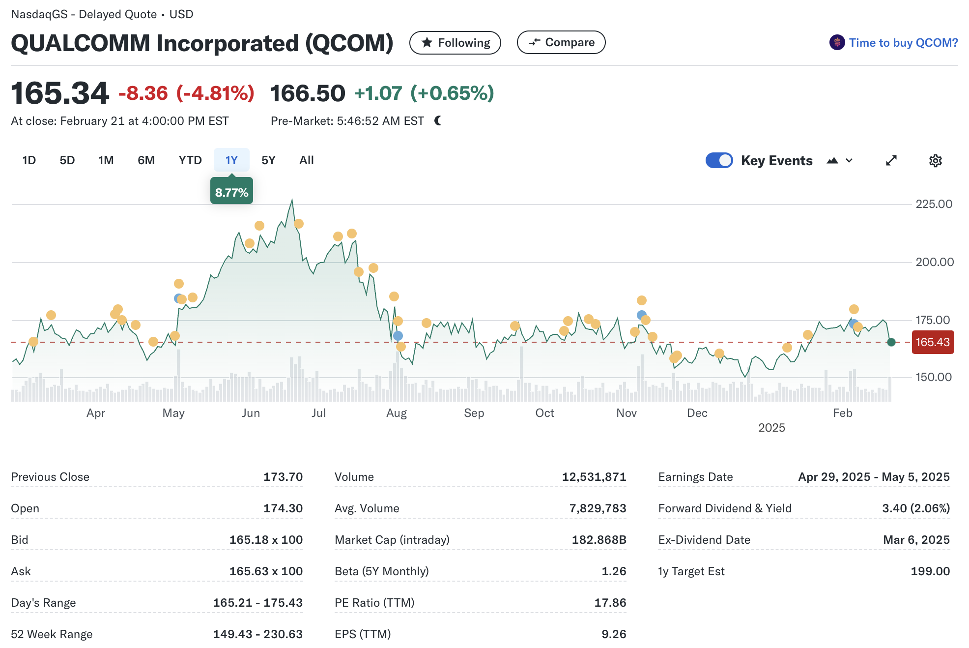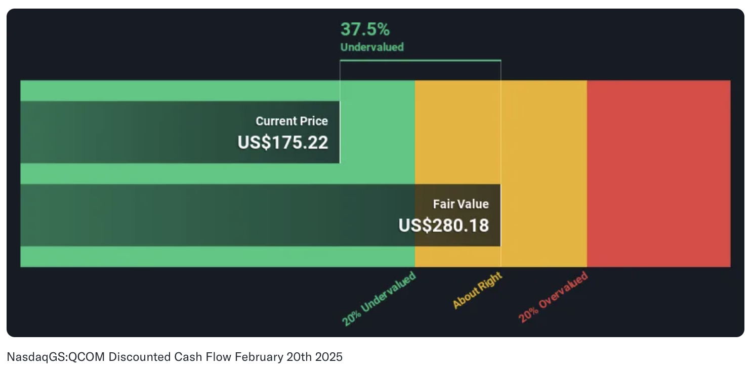 퀄컴(NASDAQ: QCOM)은 현재 주당 $175에 거래되고 있지만, 할인된 현금흐름(DCF, Discounted Cash Flow) 모델을 기반으로 분석한 결과, 퀄컴의 본질적인 가치(fair value)는 $280로 평가된다. 이는 현재 주가보다 약 37% 낮게 평가된 것으로, 투자자들에게 매력적인 저평가 종목으로 보일 수 있다.
