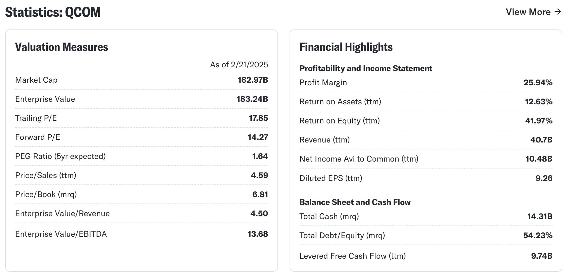 이는 현재 주가($175)보다 37% 높은 가치로 평가되며, 퀄컴이 시장에서 상당히 저평가되었음을 시사한다.