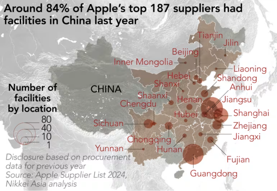 중국 내에서의 제조 또는 개발 시설도 10개 증가하여 총 286개로 확장되었습니다. 이 시설들은 중국 국내 기업 뿐만 아니라 외국 기업들도 포함하고 있어, 애플의 중국 내 기술 및 생산 기반의 깊이를 더욱 심화시키고 있습니다. - 고위급 회담 및 협력 강화: