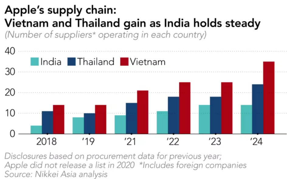 애플은 동남아시아와 인도에서의 생산 확장을 가속화하고 있습니다. 베트남에서의 공급업체 수는 40% 증가하여 35개가 되었고, 태국에서는 약 33% 증가한 24개의 공급업체가 활동 중입니다. 인도에서는 타타 그룹이 새롭게 주요 공급업체 목록에 포함되면서 현지 시장에서의 입지를 강화하고 있습니다.