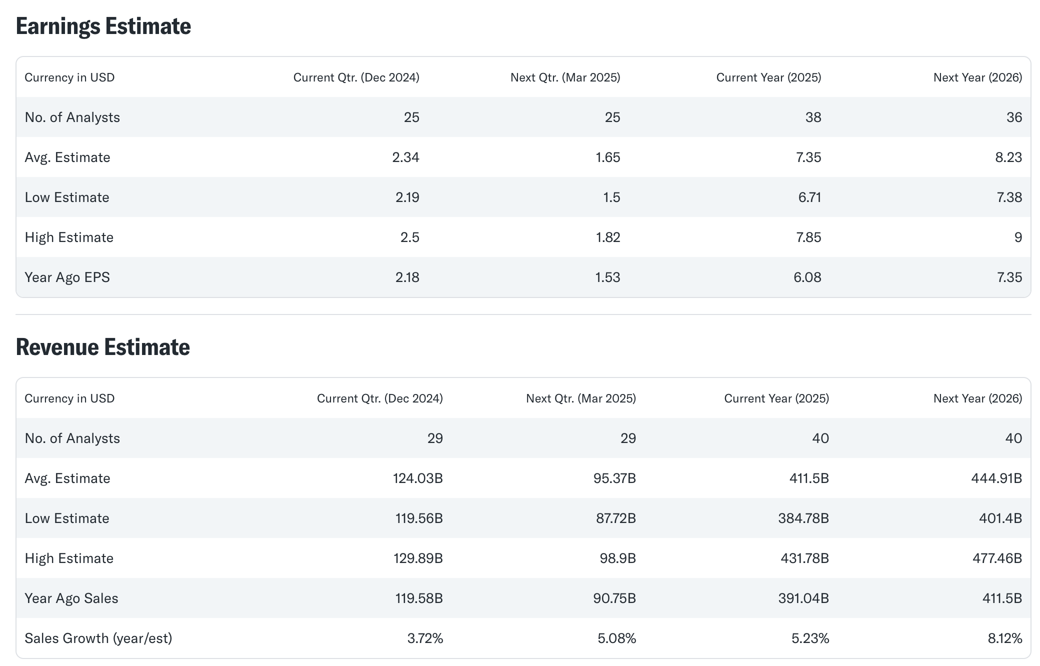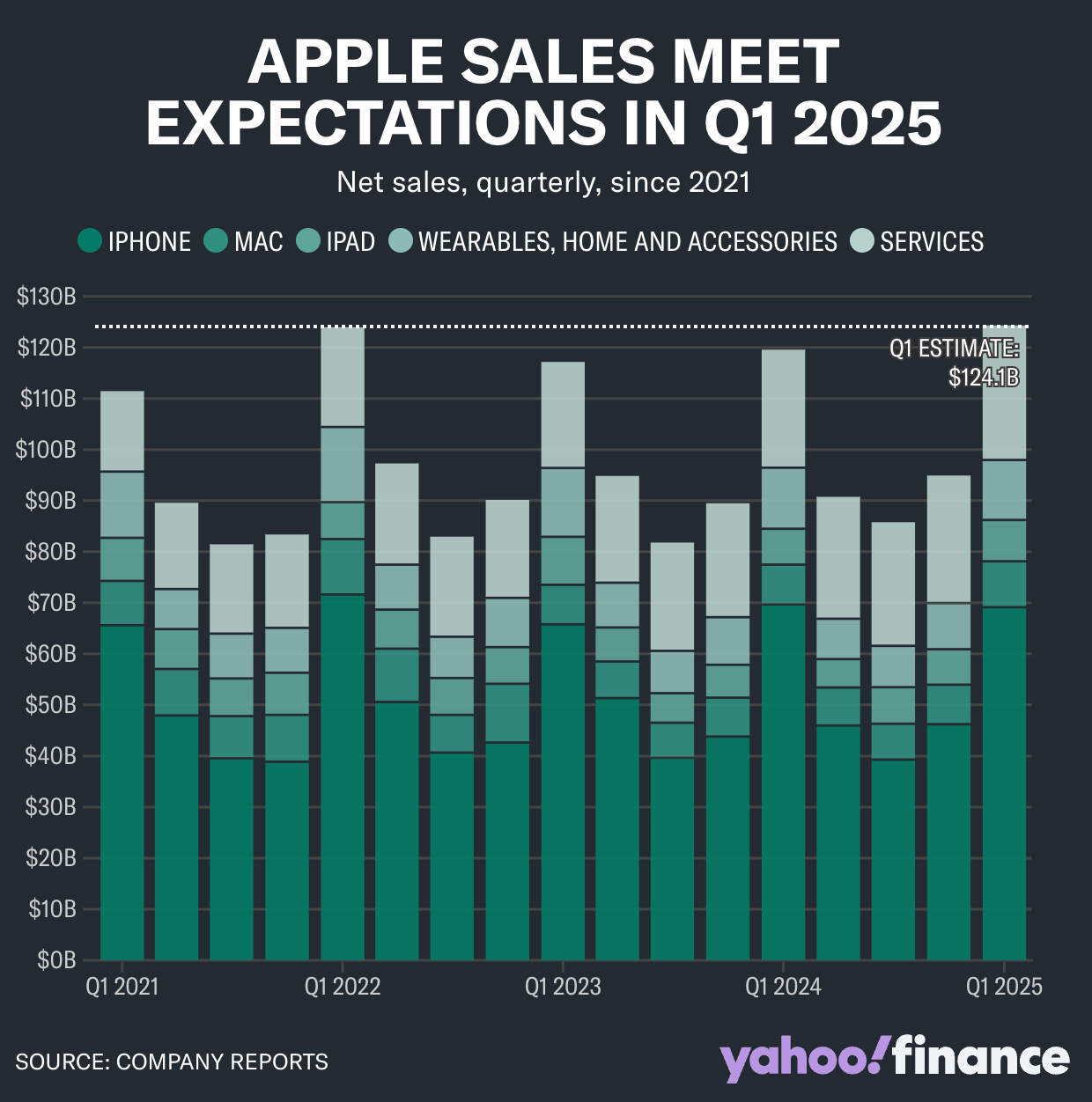 애플은 2025 회계연도 1분기에서 총 1,243억 달러의 매출과 2.40달러의 주당순이익(EPS) 을 기록하며 시장 예상을 상회했습니다. 이는 각각 전년 동기 대비 4% 및 10% 증가한 수치입니다.