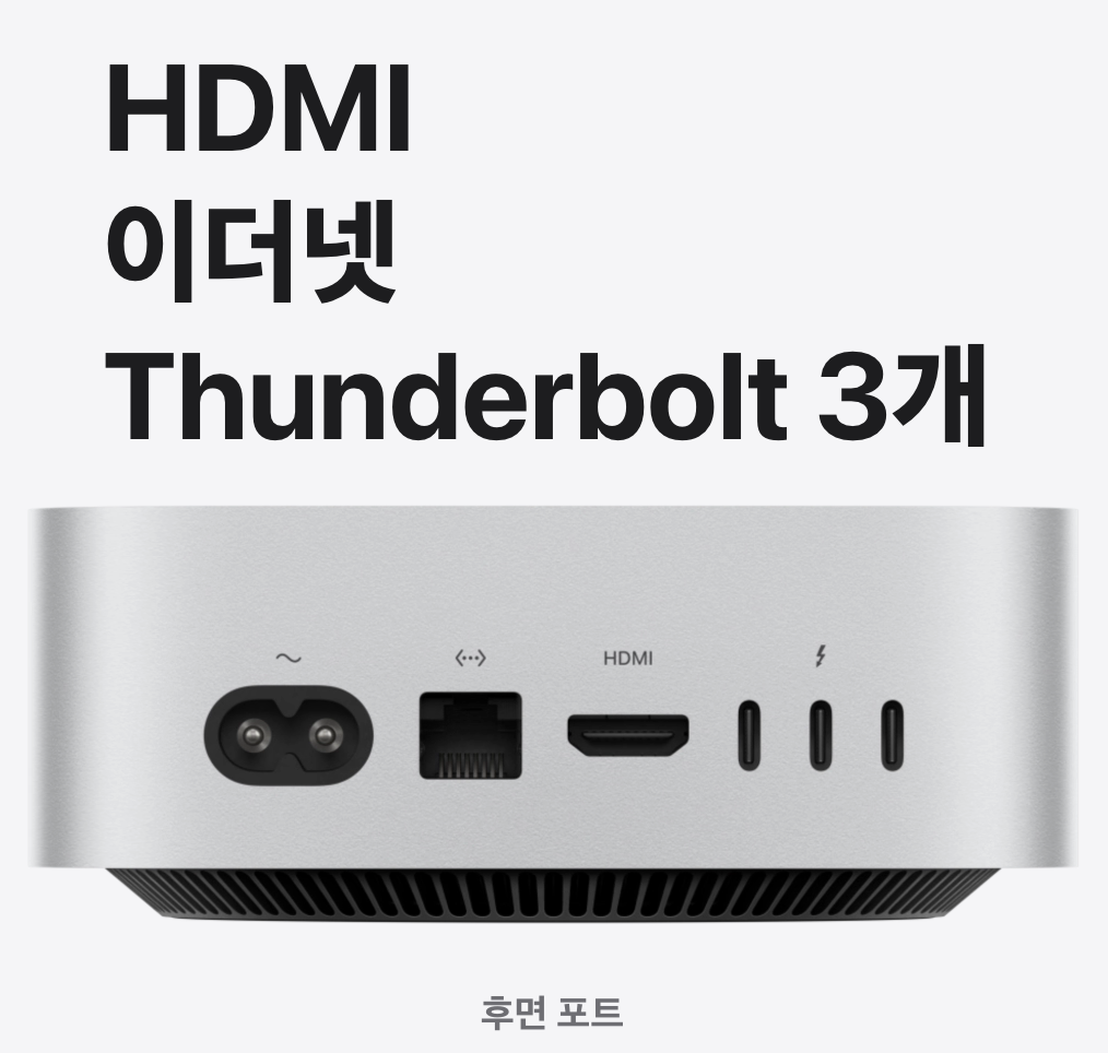 - 포트 구성: M4 맥 미니에는 다양한 포트가 장착되어 있어 호환성 면에서 우수합니다. 전면에는 USB-C 포트 2개와 3.5mm 이어폰 잭이 있어 접근성이 좋으며, 후면에는 HDMI 포트, 3개의 Thunderbolt 4 포트, 그리고 기가비트 이더넷 포트가 마련되어 있습니다. 특히 Thunderbolt 4 포트는 최대 40Gbps의 데이터 전송 속도를 지원해 외장 드라이브나 고해상도 디스플레이 연결 시 매우 유용합니다. HDMI 포트를 통해 최대 3대의 외부 디스플레이를 연결할 수 있으며, 이는 M2 맥 미니보다 한 대 더 많은 연결을 지원해 다중 작업 환경을 더욱 원활하게 만들어줍니다.