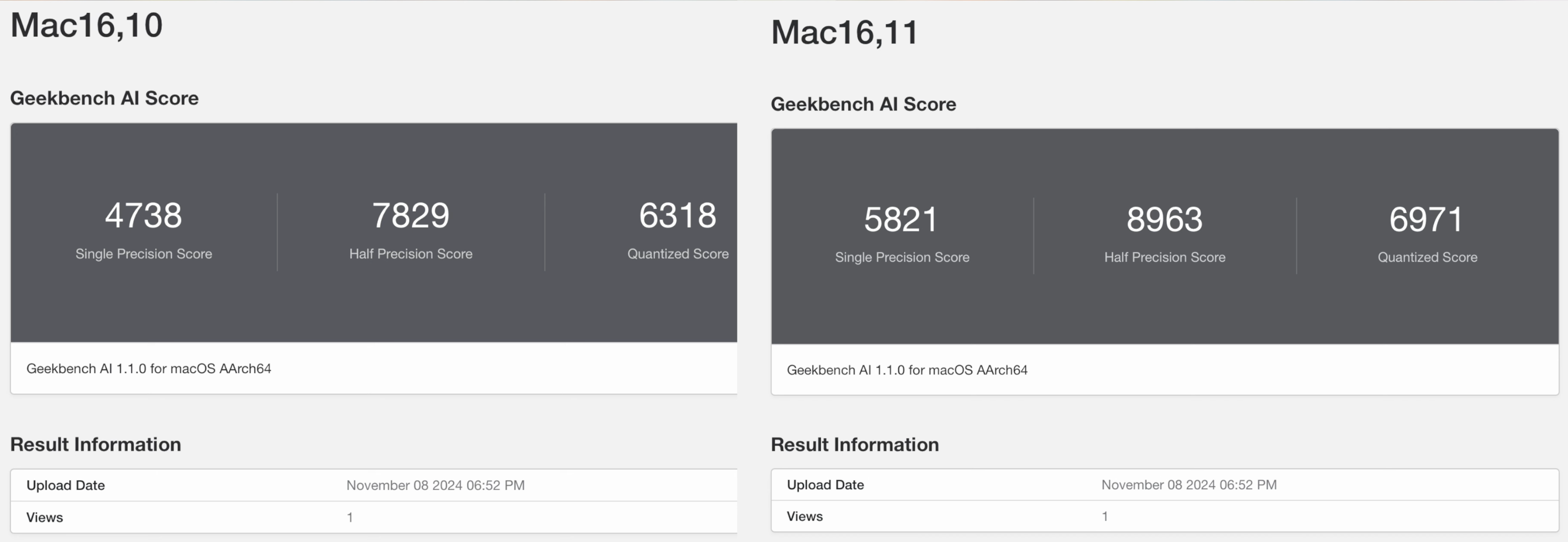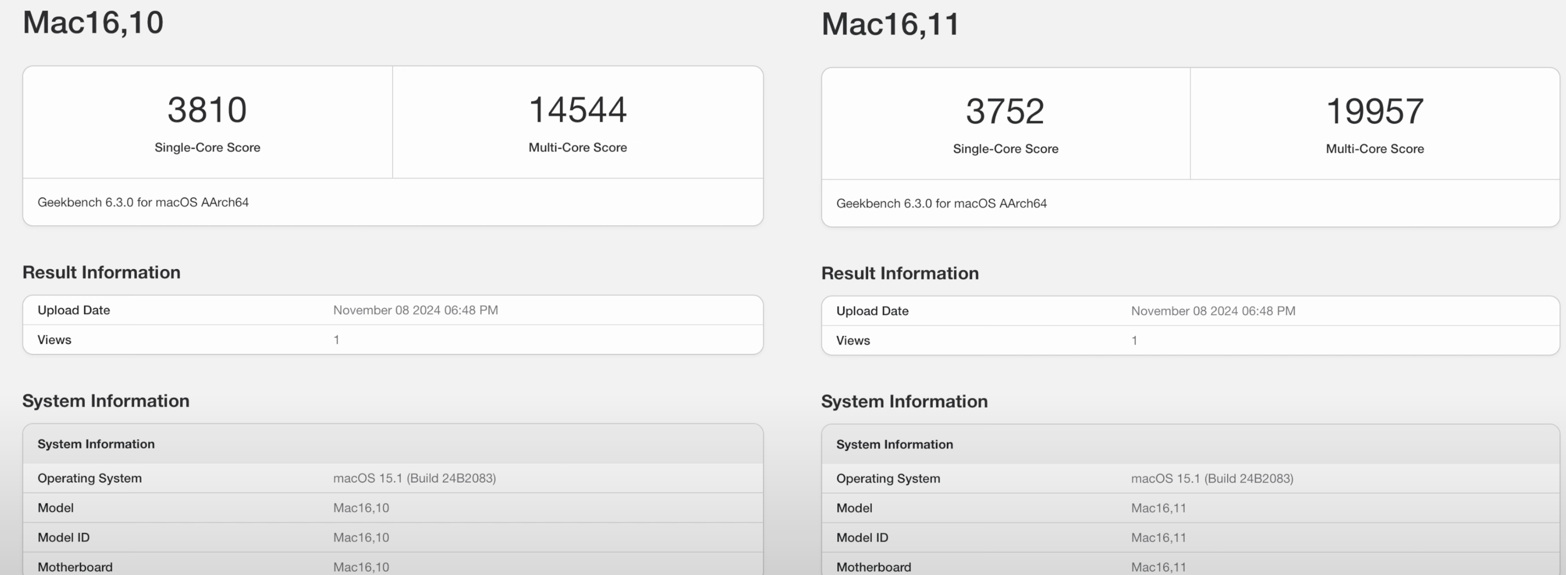 - 벤치마크 성능: Geekbench와 같은 벤치마크 테스트에서도 두 모델은 명확한 차이를 보였습니다. 싱글코어 점수는 M4가 3,810, M4 Pro가 3,752로 약간의 차이가 있지만, 멀티코어 점수에서는 M4가 14,544, M4 Pro가 19,957로 M4 Pro가 더 높은 성능을 기록했습니다. 특히 GPU 성능에서는 M4 Pro가 두드러진 성능을 보여주며, 전문적인 그래픽 작업과 영상 처리에 적합합니다.
