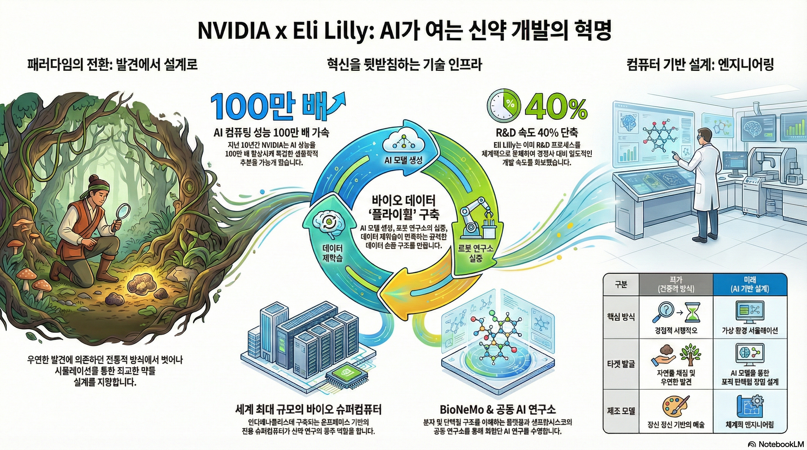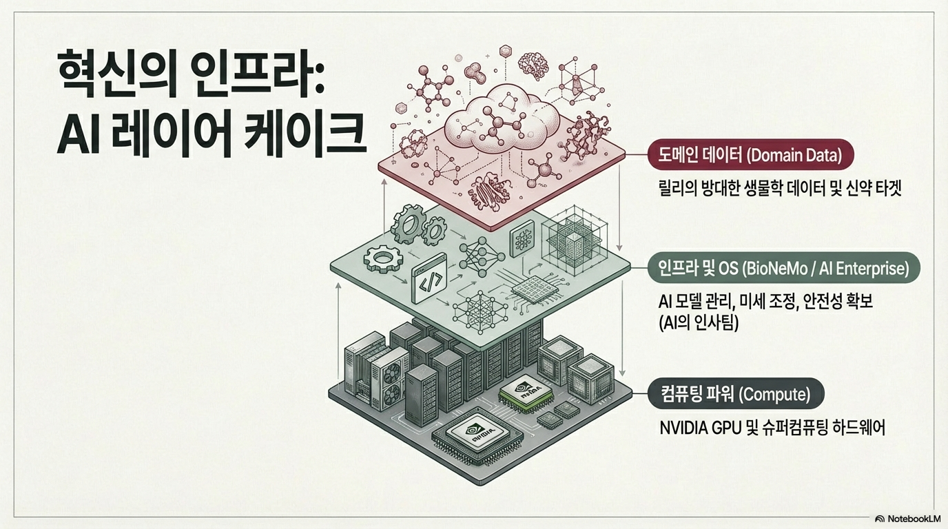 NVIDIA와 일라이 릴리는 이 혁명을 실체화하기 위해 인디애나폴리스에 세계 최대 규모의 온프레미스 바이오 전용 슈퍼컴퓨터를 구축했습니다. 또한 샌프란시스코에 '공동 AI 혁신 연구소'를 설립하여 기술과 도메인 지식을 완전히 결합합니다.