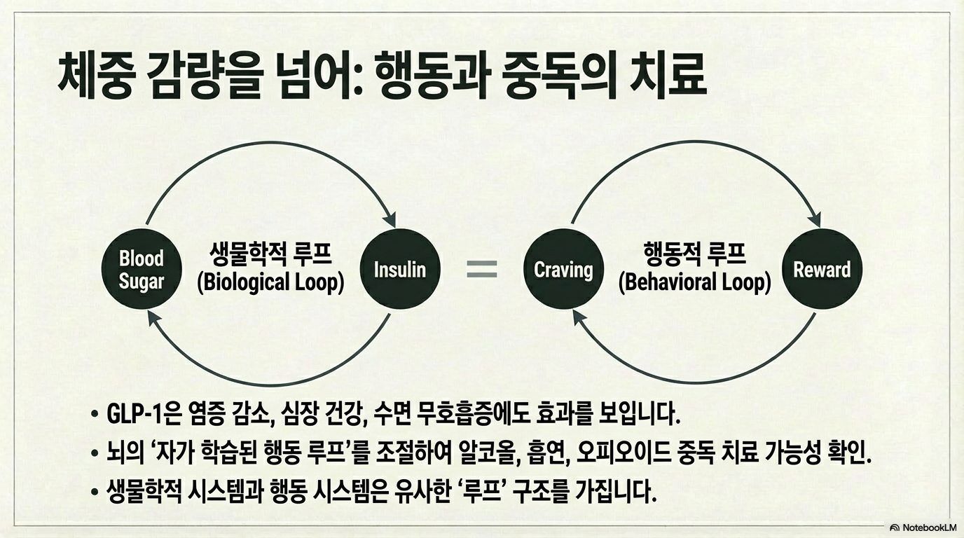• 진화적 결함의 보완: 인류는 굶주림의 시대에 적응해왔기에 '배고픔을 끄는 스위치'가 진화적으로 부족합니다. GLP-1은 풍요의 시대에 적응하지 못한 인류에게 인공적인 '포만감 스위치' 역할을 합니다.