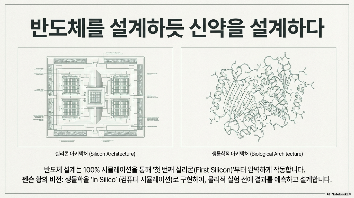 중요한 점은 이 과정이 40년 전의 반도체 설계와 닮았다는 것입니다. 당시 칩 설계는 '장인 정신'에 의존한 예술의 영역이었고, 한 번 성공하면 몇 년간 실패를 거듭하는 비효율적인 구조였습니다. 하지만 컴퓨터 지원 설계(CAD)의 등장으로 반도체는 이제 수백억 개의 트랜지스터가 단 한 번의 오차 없이 완벽하게 작동하는 '엔지니어링'의 산물이 되었습니다. 젠슨 황은 생물학 역시 이와 동일한 변곡점에 도달했다고 진단합니다.