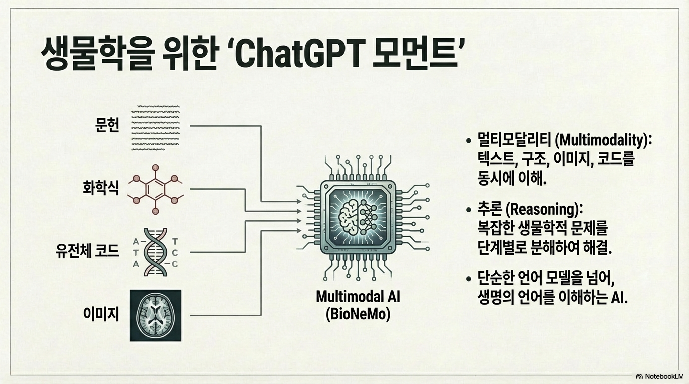 여기에 두 가지 핵심 기술이 더해집니다. 첫째는 **멀티 모달리티(Multi-modality)**입니다. AI가 텍스트, 이미지, 소리를 동시에 학습하여 '고양이'라는 개념을 입체적으로 이해하듯, 생물학적 데이터를 다각도에서 정렬하여 분석하는 기술입니다. 둘째는 **에이전틱 AI(Agentic AI)**로, AI 에이전트가 스스로 추론하고 도구를 사용하며 복잡한 문제를 단계별로 해결하는 능력입니다.