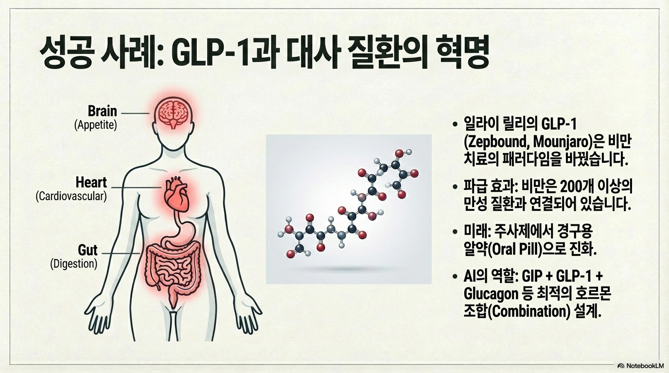 일라이 릴리의 대표적인 성공 사례인 GLP-1(Zepbound 등)은 AI와 현대 생물학이 결합했을 때 어떤 파괴력을 가지는지 보여주는 '최초의 증명(Proof of Concept)'입니다.