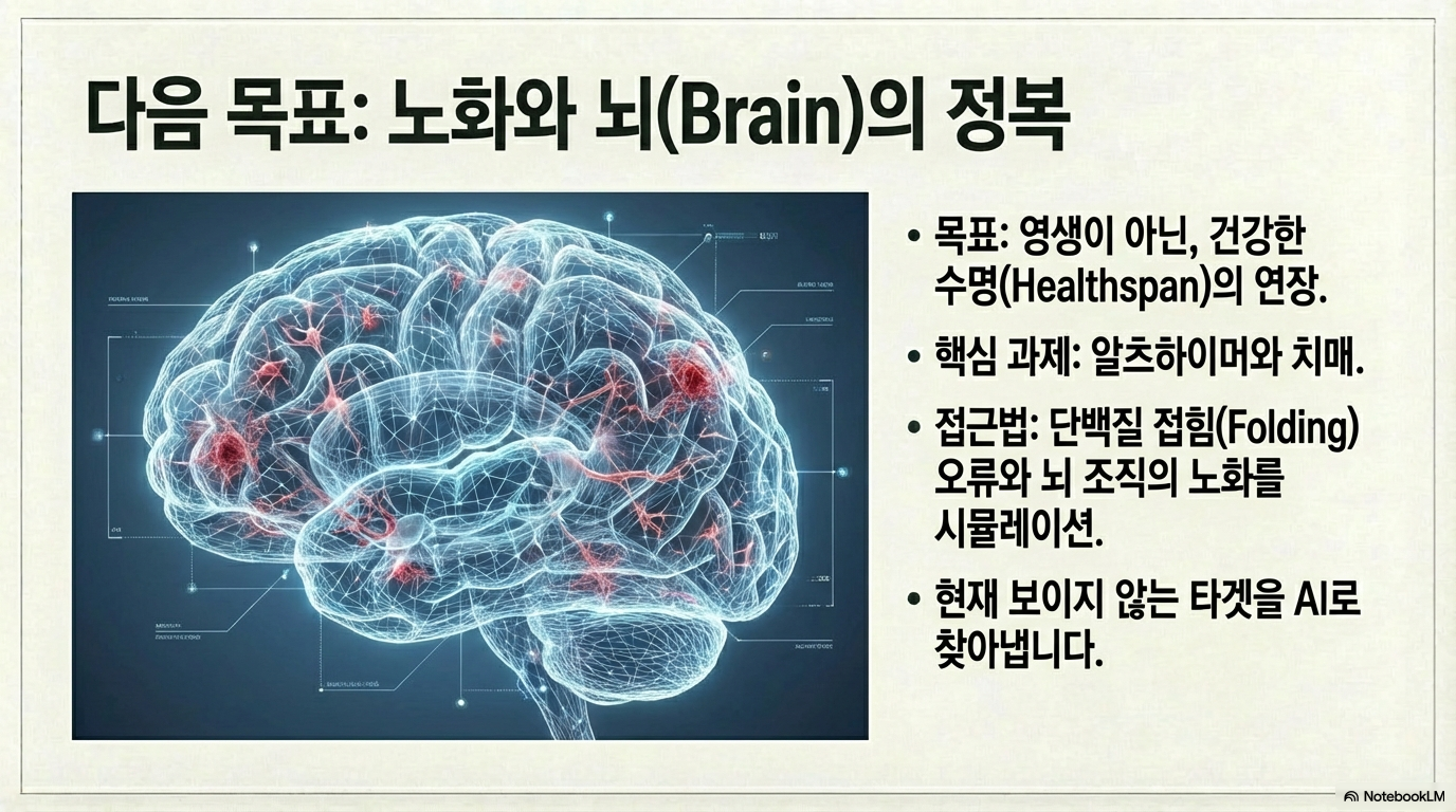 두 회사의 비전은 단순히 영생을 추구하는 것이 아닙니다. 데이비드 릭스는 이를 '질병의 압축(Compression of Morbidity)'이라고 설명합니다. 인간에게 주어진 자연적인 수명인 '100년'을 질병의 고통 없이 온전히 누리게 하려는 것입니다. 노화 자체를 막기보다 암, 치매, 대사 질환이라는 이름의 장애물을 하나씩 제거하여 누구나 100세까지 건강한 삶을 누릴 기회를 주는 것이 이들의 진정한 목표입니다.