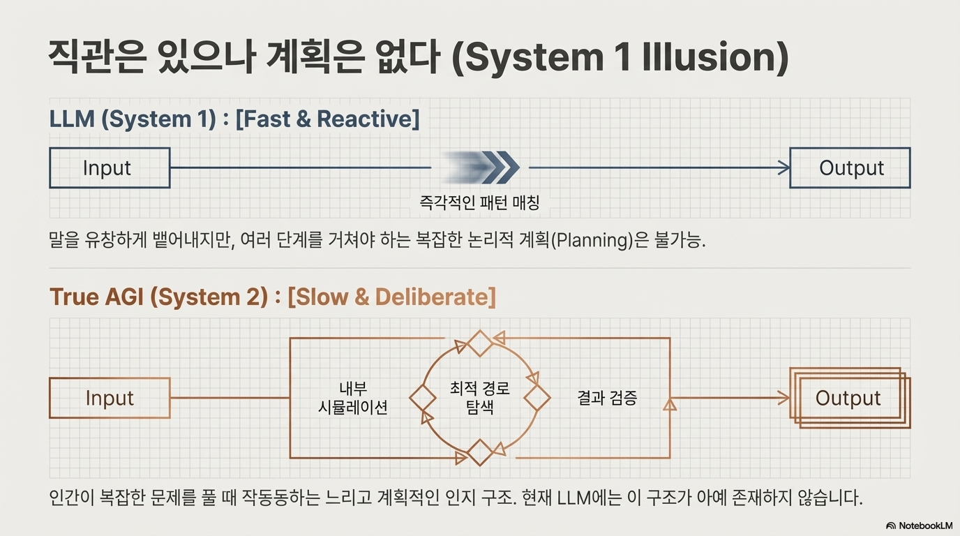전 세계가 생성형 AI, 특히 OpenAI가 쏘아 올린 거대언어모델(LLM)의 화려한 퍼포먼스에 매료되어 있습니다. 마치 인간처럼 시를 쓰고 코딩을 하며 대화하는 ChatGPT의 모습은 우리에게 곧 '인공 일반 지능(AGI)'이 도래할 것만 같은 장밋빛 환상을 심어주었습니다. 하지만 기술의 심연을 들여다보는 전문가들의 시선은 사뭇 다릅니다.