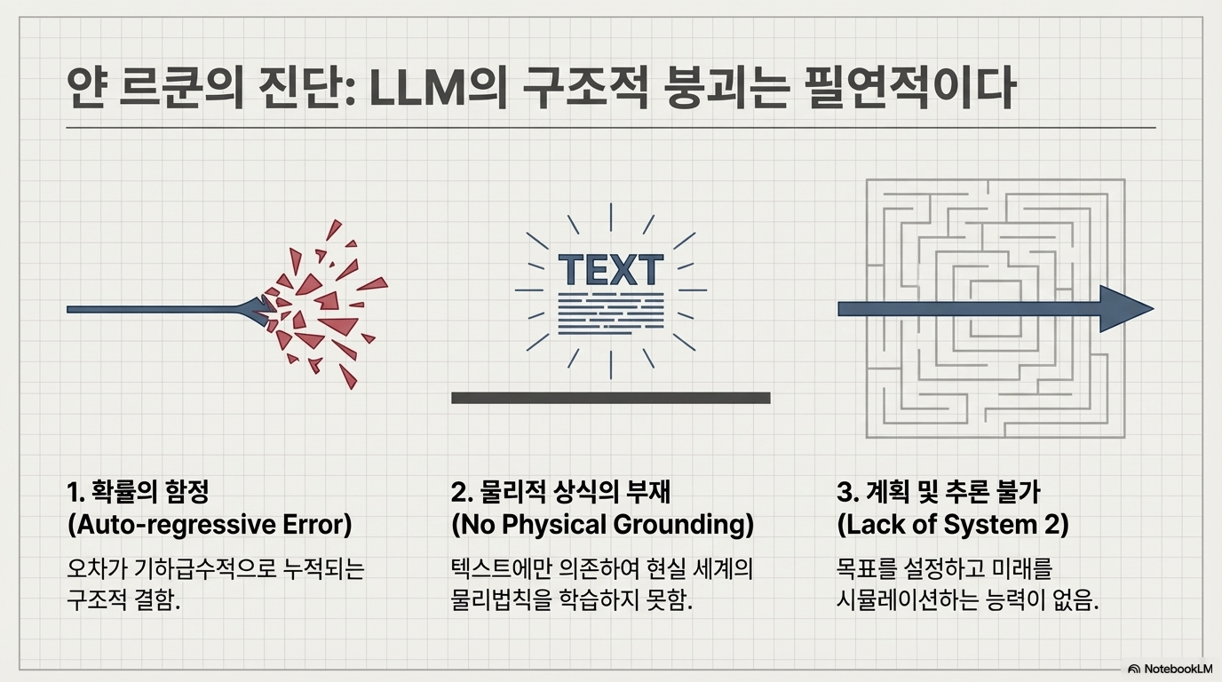 현재 LLM이 작동하는 근본 원리는 '자기회귀 모델(Autoregressive Model)'에 기반한 '다음 단어 예측(Next Token Prediction)'입니다. 이는 방대한 양의 텍스트 데이터를 학습하여 통계적으로 가장 확률이 높은 다음 단어를 제시하는 방식입니다. 얀 르쿤은 바로 이 지점에서 LLM의 근본적인 지능 결여를 지적합니다.