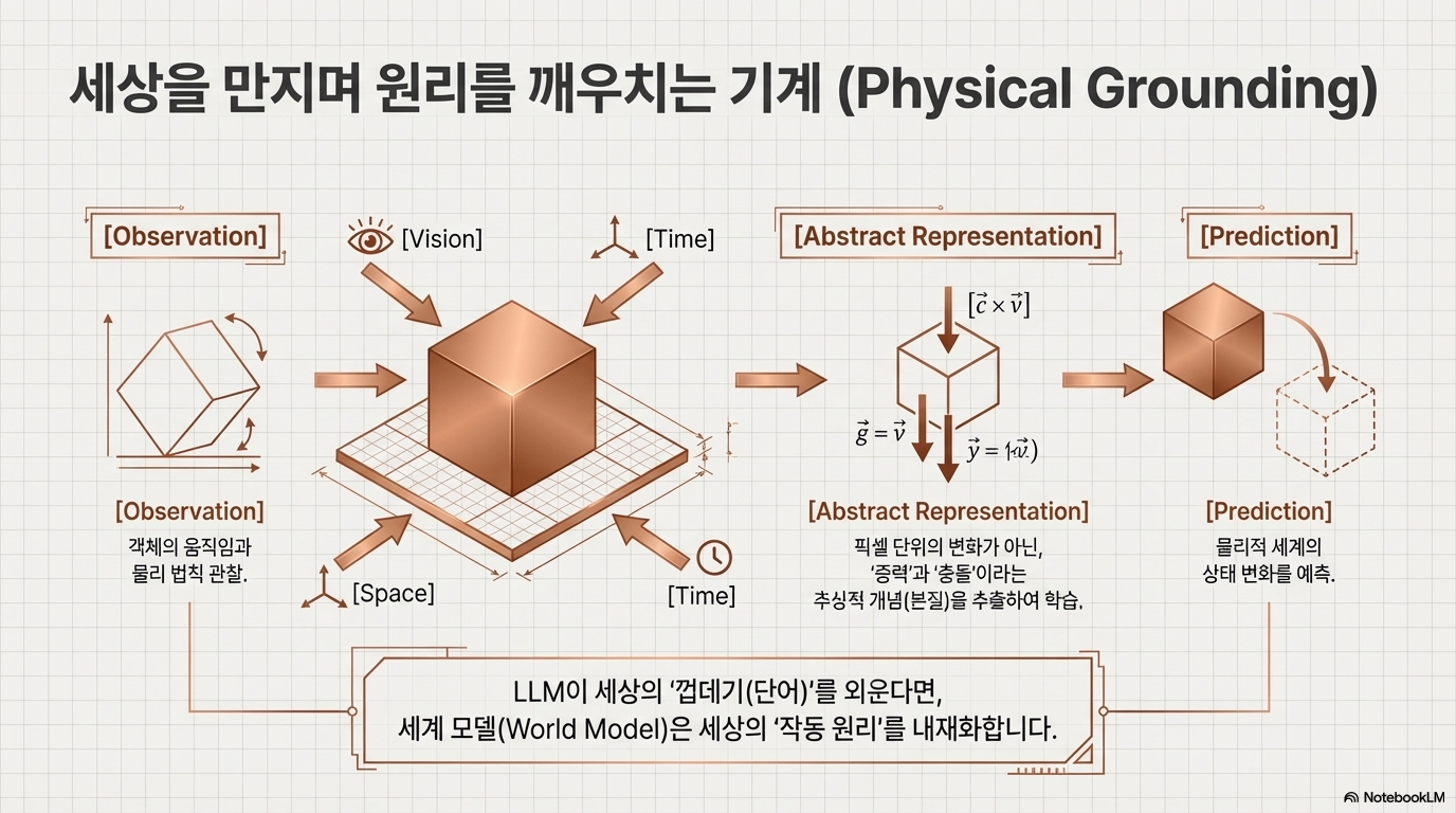 - 관찰을 통한 상식 습득: 텍스트가 아닌 비디오와 같은 시각 데이터를 통해 '무엇이 가능하고 무엇이 불가능한지'를 스스로 파악합니다.