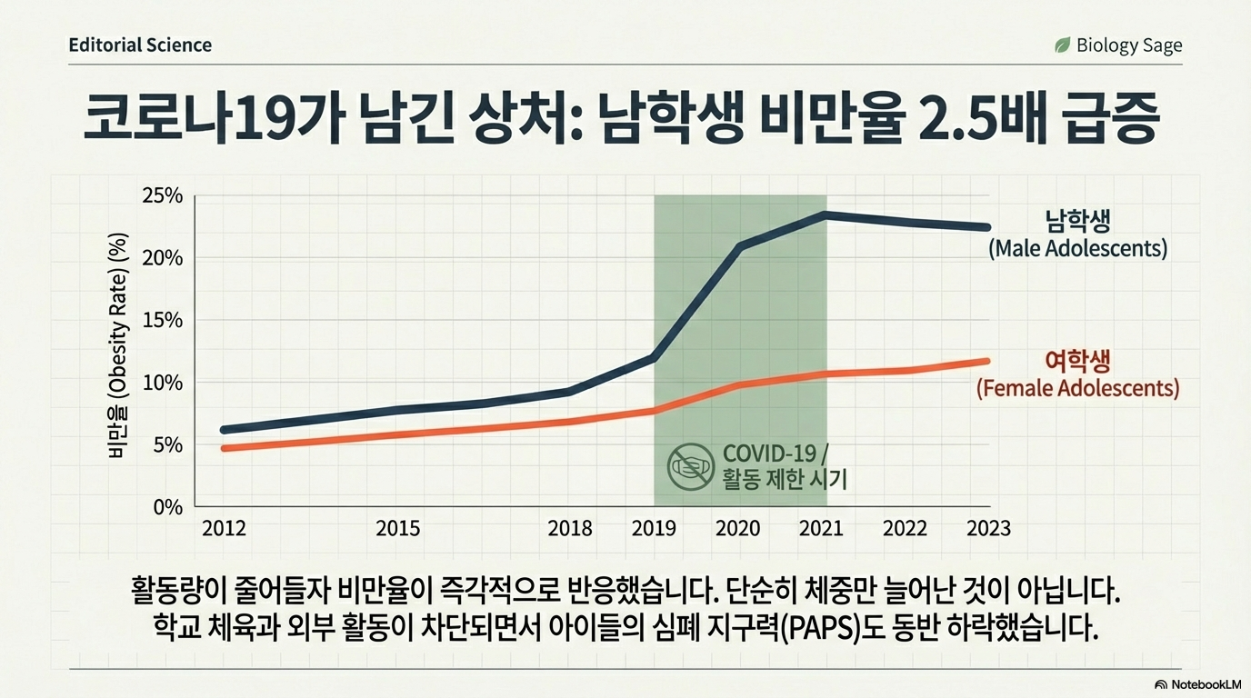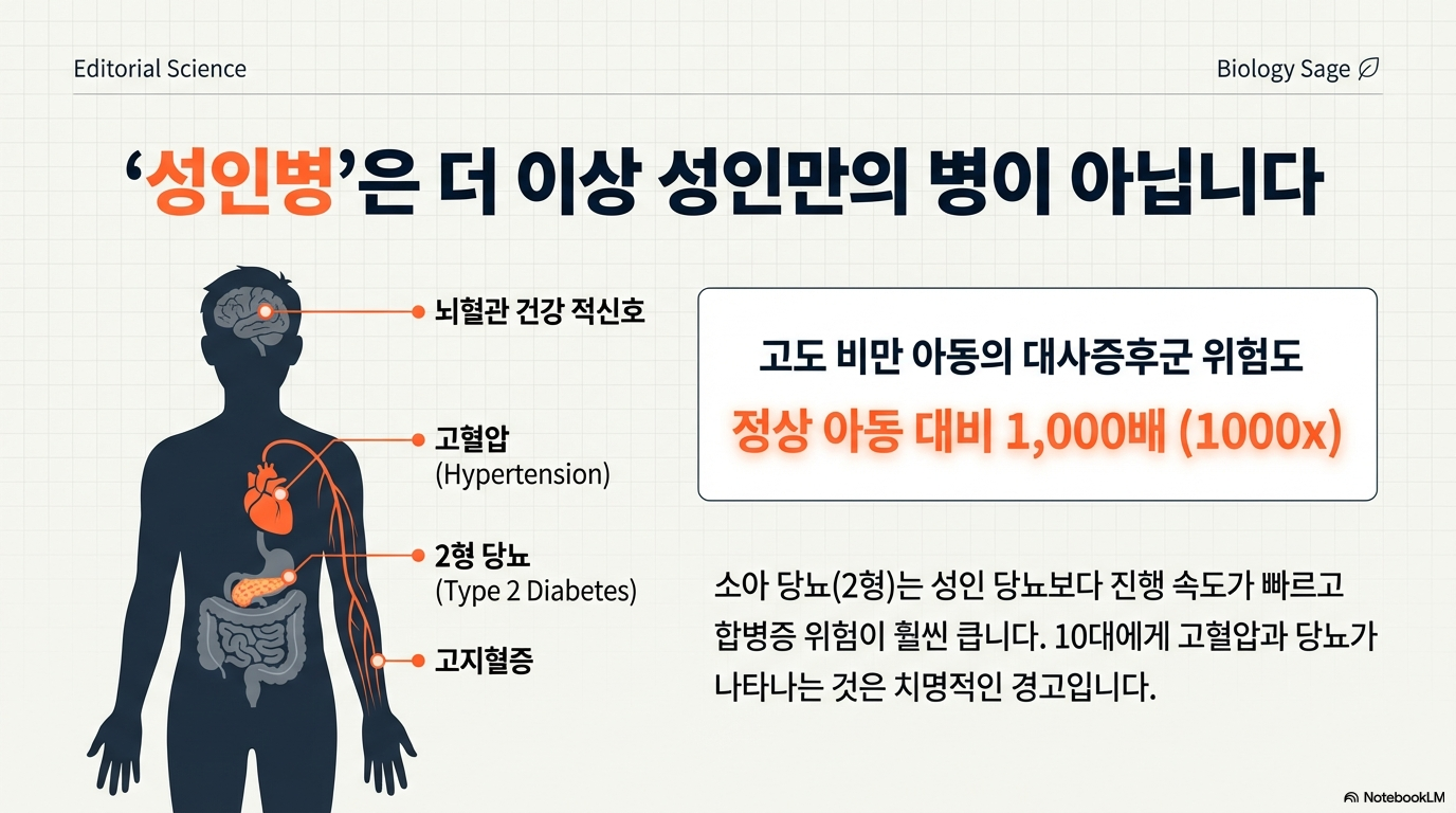 이러한 활동 부족은 소아·청소년 비만율 급증으로 직결됩니다. 한국은 동아시아 4개국(한국, 일본, 중국, 대만) 중 청소년 비만율이 가장 높으며, 특히 남학생의 증가 속도가 매우 빠릅니다. 소아 비만이 위험한 이유는 단순히 성인 비만으로 이어질 확률이 높기 때문만이 아닙니다. 미취학 아동기 과체중은 성인 비만 위험을 5배 높이며, 비만 청소년은 정상 체중 또래에 비해 대사증후군 발생 위험이 1,000배 가까이 치솟을 수 있습니다. 제2형 당뇨, 고혈압, 고지혈증 같은 '성인병'이 더 이상 성인만의 문제가 아니게 된 것입니다.