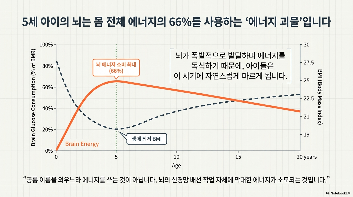 이 막대한 에너지는 공룡 이름을 외우는 것과 같은 의식적인 학습 활동이 아니라, 뇌의 구조적인 완성을 위해 사용됩니다. 수많은 신경세포 연결망인 시냅스(synapse)를 폭발적으로 형성하고, 신경 신호 전달 속도를 높이는 수초화(myelination) 과정에 거의 모든 에너지가 투입되는 것입니다. 결론적으로 아이가 만 5세 무렵에 체질량지수(BMI)가 인생 최저점을 기록하는 가장 큰 이유는, 바로 뇌가 일생에서 가장 극적인 발달을 이루며 막대한 에너지를 필요로 하기 때문입니다.