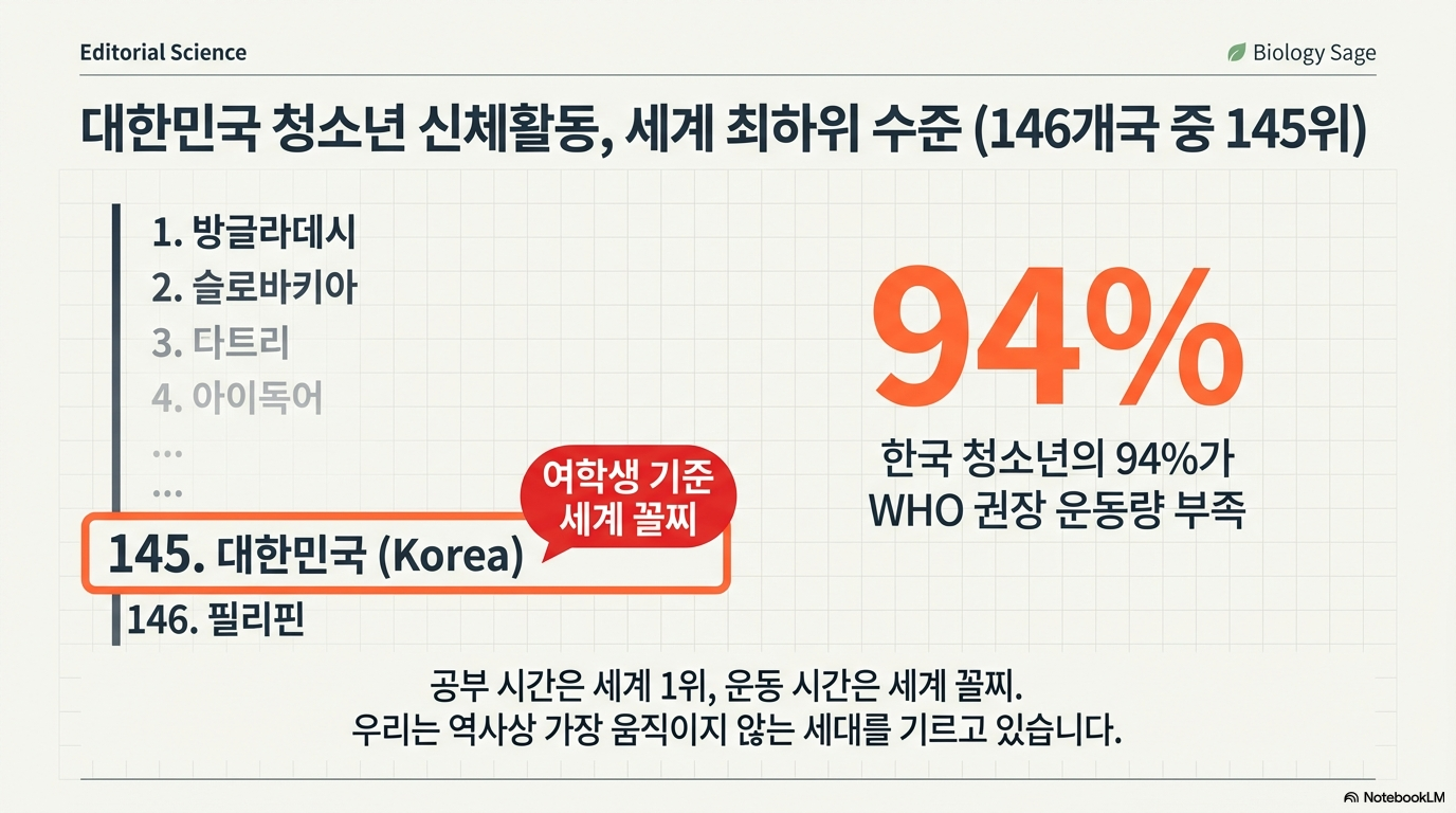 세계보건기구(WHO)는 소아·청소년에게 성인 권장량(주 150분)의 두 배가 넘는 매일 최소 60분 이상의 중고강도 신체 활동을 권고합니다. 하지만 2016년 의학 저널 <랜싯(Lancet)>에 발표된 데이터는 충격적입니다. 전 세계적으로도 상황이 우려스럽지만, 한국은 완전한 위기 수준입니다. 90%가 넘는 한국 청소년들이 최소 활동 지침을 충족하지 못했으며, 구체적인 순위는 더욱 암담합니다. 전 세계 146개국 중 한국 남학생은 145위, 여학생은 146위로 최하위를 기록했습니다.
