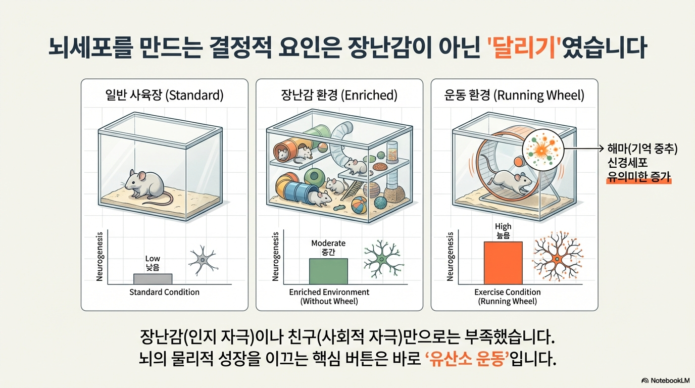 결과는 놀라웠습니다. 기억의 중추인 해마에서 새로운 신경세포의 성장을 촉진한 가장 결정적인 단 하나의 요소는 바로 '쳇바퀴'였습니다. 쳇바퀴가 있었던 그룹은 신경세포가 눈에 띄게 증가했지만, 장난감과 사회적 교감만 제공된 그룹은 별다른 변화를 보이지 않았습니다. 이는 자발적인 신체 활동이 뇌 발달에 얼마나 중요한지를 명확하게 보여줍니다.