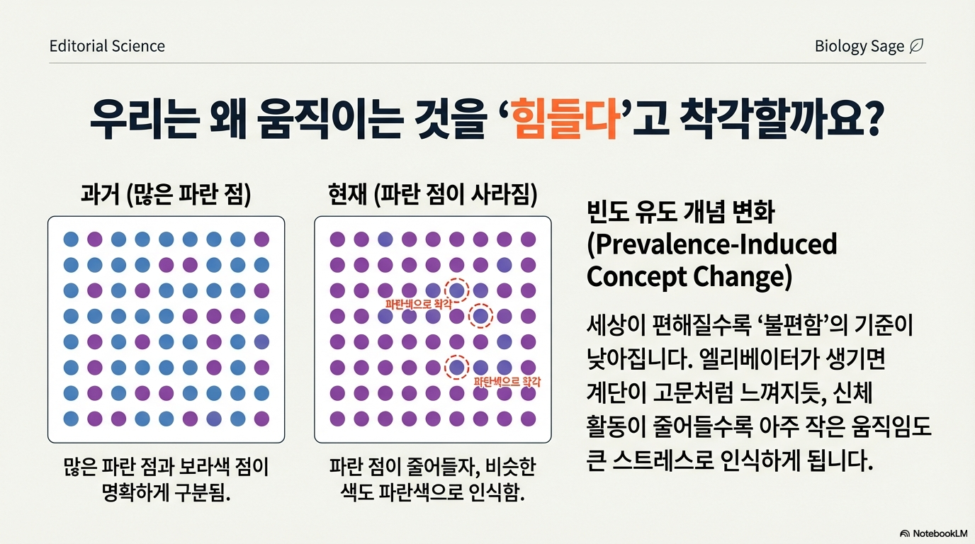 우리는 왜 점점 더 움직이지 않게 되었을까요? 한 심리 실험이 그 단서를 제공합니다. 연구진은 참가자들에게 보라색 점들 사이에 섞여 있는 파란색 점을 찾게 했습니다. 처음에는 파란색 점을 자주 보여주다가, 점차 그 빈도를 줄였습니다. 그러자 놀라운 현상이 나타났습니다. 참가자들은 파란색 점이 드물어지자, 이전에는 보라색이라고 판단했던 애매한 색의 점까지 '파란색'이라고 정의하기 시작했습니다.