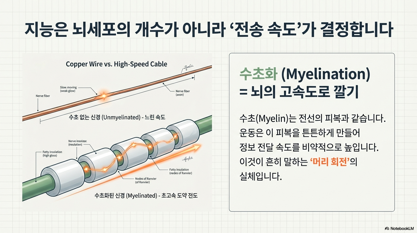 뇌의 신경세포는 축삭(axon)이라는 긴 섬유를 통해 전기 신호를 전달합니다. 이때 '수초화(myelination)'라는 과정이 신호 전달의 효율을 극적으로 높입니다. 수초는 전선의 절연 피복처럼 축삭을 감싸는 지방질 막으로, 전기 신호가 중간에 새지 않고 건너뛰며(도약 전도) 훨씬 빠르게 전달되도록 돕습니다.