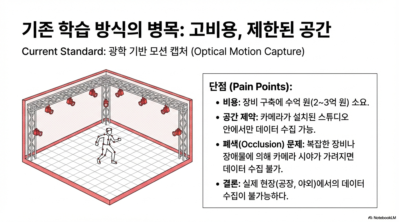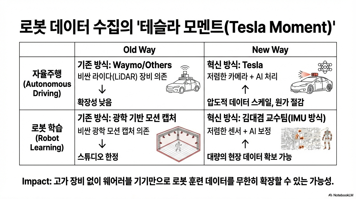분석 및 성찰: 이 방식은 테슬라가 고가의 라이다(LiDAR) 대신 저렴한 카메라 8대만으로 자율주행 데이터를 모은 전략과 궤를 같이합니다. 이는 인프라 의존형 데이터(MoCap/LiDAR)에서 **디바이스 중심 데이터(IMU/Camera)**로의 패러다임 전환을 의미합니다. 스마트폰이나 웨어러블 기기의 IMU 데이터를 활용할 수 있게 됨으로써, 로봇 학습용 '빅데이터'의 대중화가 가능해진 것입니다.