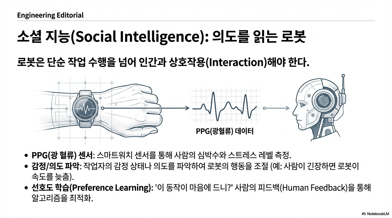 이를 위해 로봇은 단순히 사물을 보는 것을 넘어 **'시멘틱 레이어(Semantic Layer)'**를 구축해야 합니다. 이는 데이터 간의 논리적 관계를 뜻하는 기존의 시멘틱과 달리, "저 의자는 내가 앉을 수 있는 곳인가?", "저 문은 내가 열 수 있는가?"와 같은 나와 물리 세계 사이의 관계를 정의하는 지능입니다. 여기에 힘의 세기를 느끼는 '키네틱 데이터'와 인간의 감정을 읽는 '심박수(PPG) 센서'가 통합되면 로봇은 비로소 인간의 의도를 이해하는 지능형 동반자가 됩니다.