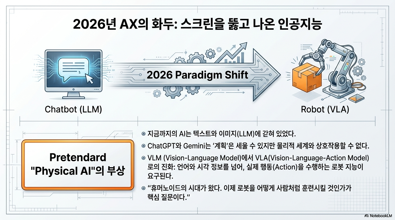 오늘날 모든 기업이 'AI 전환(AX, AI Transformation)'을 외치고 있지만, 대다수 리더에게 그 실체는 여전히 모호합니다. 화면 속의 텍스트와 이미지를 생성하는 수준을 넘어, 이제는 AI가 물리적 실체를 입고 현실 세계와 상호작용하는 '피지컬 AI(Physical AI)'의 시대가 도래하고 있습니다. 2026년 로드맵의 핵심이 될 피지컬 AI는 단순히 기계에 지능을 넣는 것을 넘어, '시멘틱 레이어(Semantic Layer)'와 '키네틱 데이터(Kinetic Data)'를 통해 로봇이 인간의 삶을 재정의하는 과정입니다.