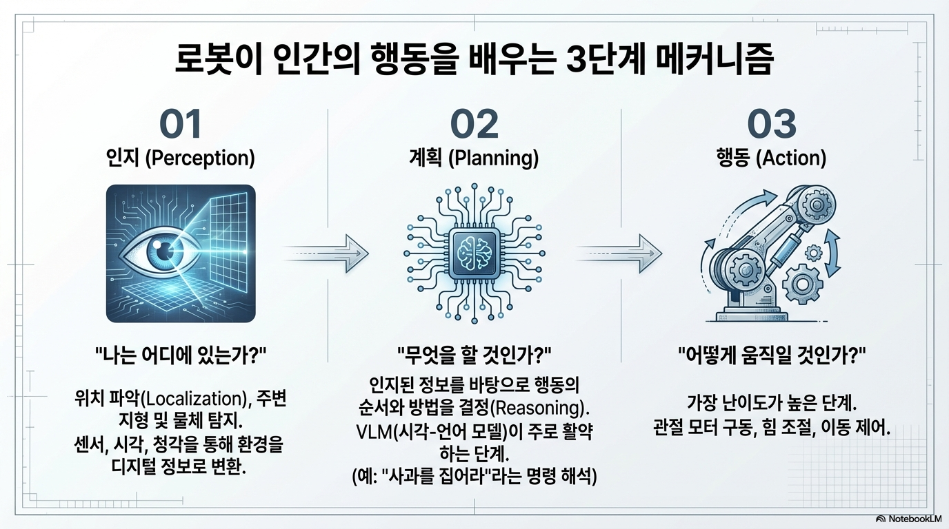 로봇이 인간의 행동을 학습하는 과정은 정교한 메커니즘을 따릅니다. 단순히 명령어를 수행하는 것이 아니라, 주변 환경을 이해하고 논리적인 판단을 거쳐 물리적인 힘으로 변환해야 하기 때문입니다.