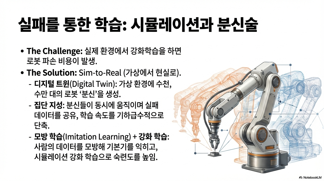 로봇의 지능은 실제 세상에서만 학습되지 않습니다. 오히려 가상 환경에서의 수만 번의 '실패'가 로봇을 완성합니다.