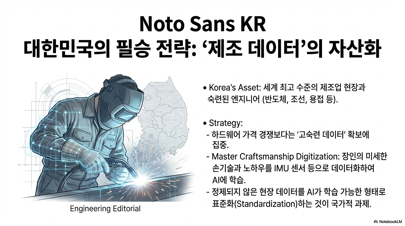 반도체 공정의 정밀한 조작, 조선업 현장의 숙련된 용접 기술 등은 중국이 쉽게 흉내 낼 수 없는 고부가가치 데이터입니다. 한국 엔지니어들의 섬세한 '손기술' 데이터는 피지컬 AI 시대에 가장 강력한 경쟁 우위가 될 것입니다.