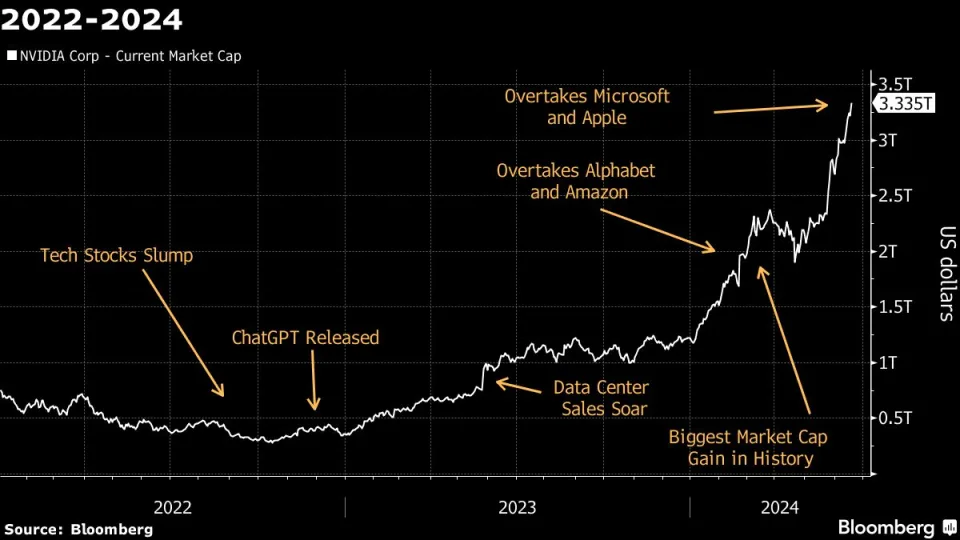 약 3.3조 달러의 시장 가치를 가진 엔비디아는 최근 마이크로소프트와 애플 같은 기술 대기업을 제치고 선두에 올랐습니다. 분석가들은 엔비디아, 애플, 마이크로소프트 간의 4조 달러 시장 가치 경쟁이 치열할 것이라고 예측하고 있습니다. 엔비디아의 빠른 성장은 이러한 이정표를 달성할 잠재력을 나타내며, 지속적인 혁신과 AI 솔루션에 대한 수요 증가가 이를 뒷받침합니다.