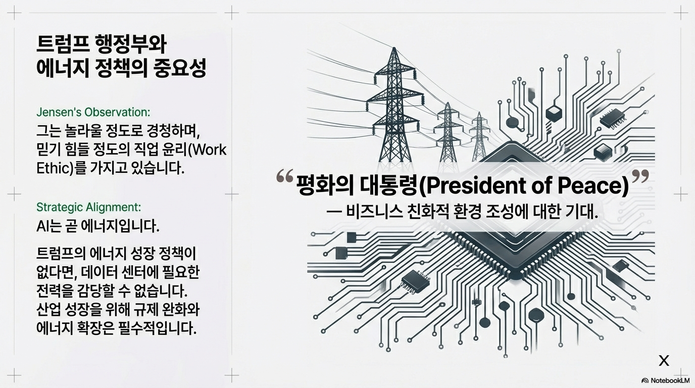 젠슨 황이 개인적으로 관찰한 트럼프 대통령의 모습은, 널리 알려진 대중적 이미지와는 사뭇 다른 지점들이 있어 흥미롭습니다. 그는 특히 두 가지 자질이 매우 인상 깊고 예상 밖이었다고 강조합니다. 첫째는 트럼프 대통령이 자신이 했던 모든 말을 기억할 정도로 "비범하게 뛰어난 경청가"라는 점입니다. 둘째는 끊임없이 일하는 "믿을 수 없는 근면성"을 가졌다는 것입니다.