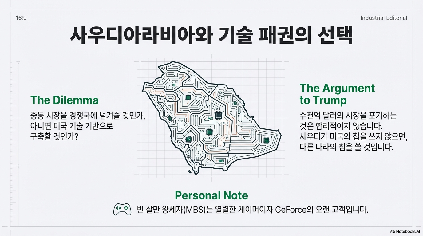 황은 중동에 첨단 AI 칩을 판매하는 결정에 대해 단순하고 전략적인 논리를 제시합니다. 그는 이 결정을 단 하나의 질문으로 귀결시킵니다. "필연적으로 구축될 중동의 AI 인프라를 미국의 기술 스택 위에 세워야 하는가, 아니면 다른 누군가의 것 위에 세워야 하는가?"