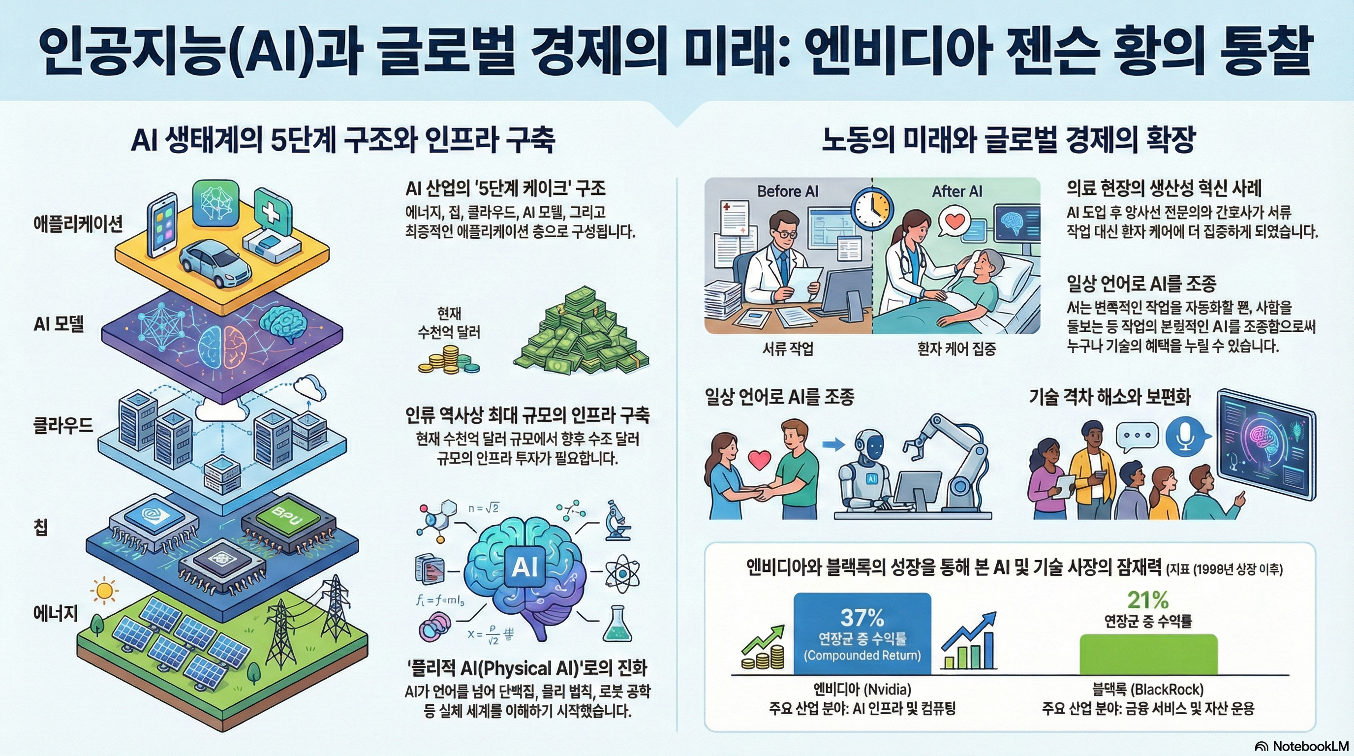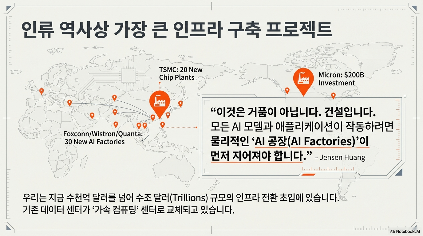 이러한 새로운 기회는 단순히 기존 직업의 효율성이 높아지는 데 그치지 않습니다. 젠슨 황이 지적하듯, 이는 인류 역사상 가장 거대한 인프라 구축 프로젝트가 시작되었기 때문입니다.