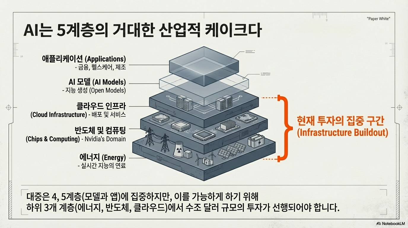 대부분의 사람들은 AI라고 하면 챗GPT 같은 애플리케이션을 떠올립니다. 하지만 젠슨 황은 AI 산업을 에너지, 칩/컴퓨팅 인프라, 클라우드 인프라, AI 모델, 그리고 애플리케이션 계층으로 구성된 '5단 케이크'에 비유하며 더 큰 그림을 제시합니다. 이 비유가 중요한 이유는 우리가 흔히 AI라고 생각하는 애플리케이션 계층이 사실은 거대하고 보이지 않는 물리적, 경제적 기반 위에 서 있는 가장 작은 마지막 조각에 불과하다는 점을 명확히 보여주기 때문입니다.
