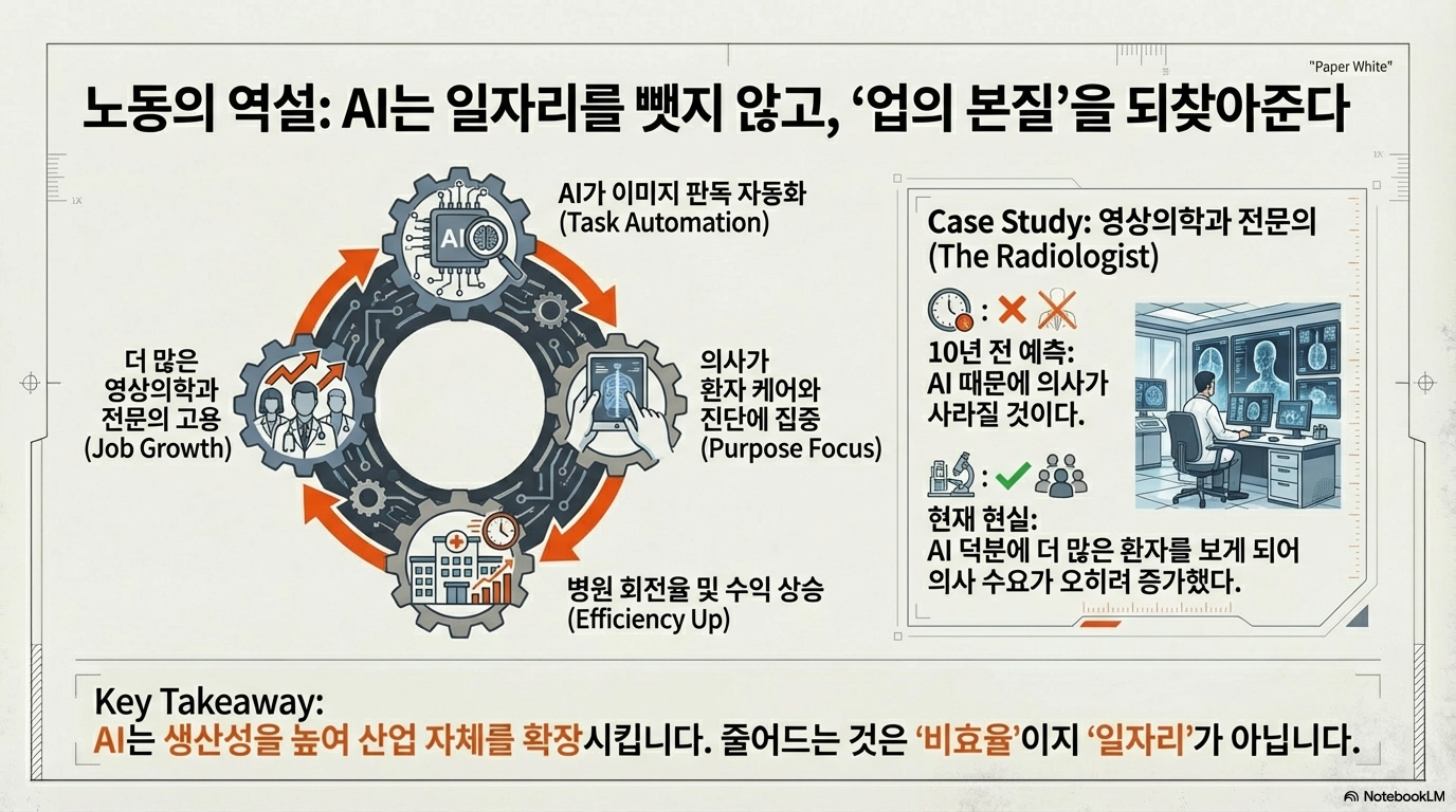 대표적인 예로 영상의학과 의사를 들 수 있습니다. AI가 이미지 스캔 판독이라는 '업무'에서 초인적인 능력을 보이자, 많은 이들은 영상의학과 의사라는 직업이 사라질 것이라고 예측했습니다. 하지만 현실은 달랐습니다. 영상의학과 의사의 진정한 '목적'은 질병을 진단하고 환자를 돌보는 것이었습니다. AI 덕분에 의사들은 스캔 판독 업무를 훨씬 효율적으로 처리하게 되었고, 절약된 시간을 환자 및 다른 임상의와 소통하는 데 더 많이 사용할 수 있게 되었습니다. 결과적으로 생산성 향상은 더 많은 환자를 진료할 수 있는 능력으로 이어졌고, 오히려 더 많은 영상의학과 의사를 고용하는 결과로 나타났습니다.