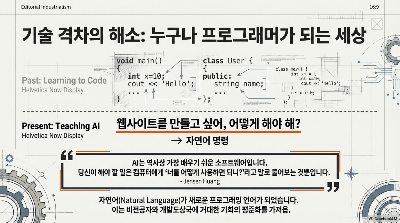 AI가 교육 수준이 높은 이들과 그렇지 않은 사람들 사이의 격차를 더욱 벌릴 것이라는 우려가 있습니다. 하지만 젠슨 황은 AI가 오히려 기술 격차를 '해소'하는 민주적인 힘이 될 것이라고 낙관합니다. 그 이유는 AI가 역사상 가장 사용하기 쉬운 소프트웨어이기 때문입니다.