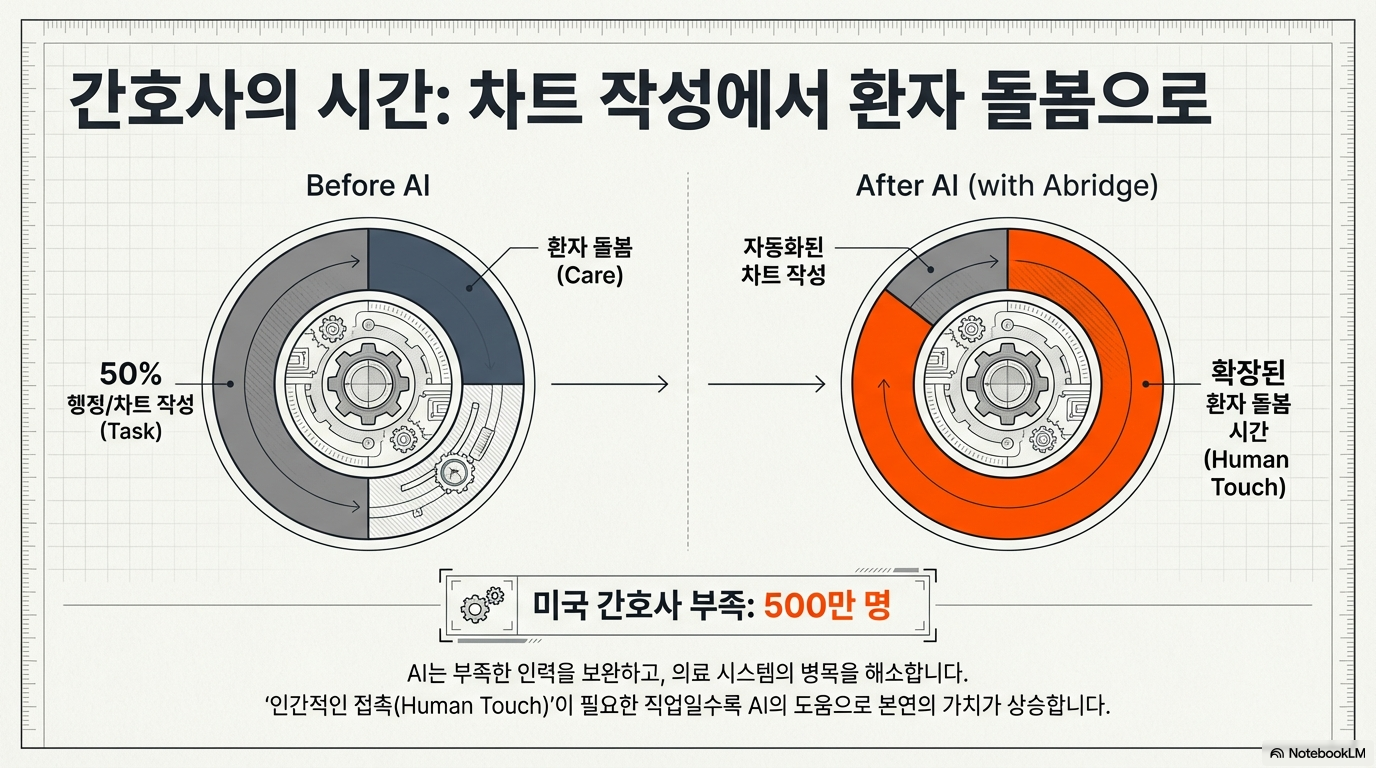 간호사의 경우도 마찬가지입니다. AI는 환자 기록 작성과 같은 반복적인 '업무'를 자동화하여 간호사들이 본연의 '목적'인 환자 돌봄에 더 집중할 수 있도록 돕습니다. 이로 인해 병원의 환자 수용 능력이 증가하고 더 나은 의료 서비스를 제공하게 되면서 더 많은 간호사를 채용하게 됩니다. 이처럼 '목적'과 '업무'를 구분하는 프레임워크는 AI가 특정 직업에 미칠 영향을 이해하는 핵심적인 틀을 제공합니다.