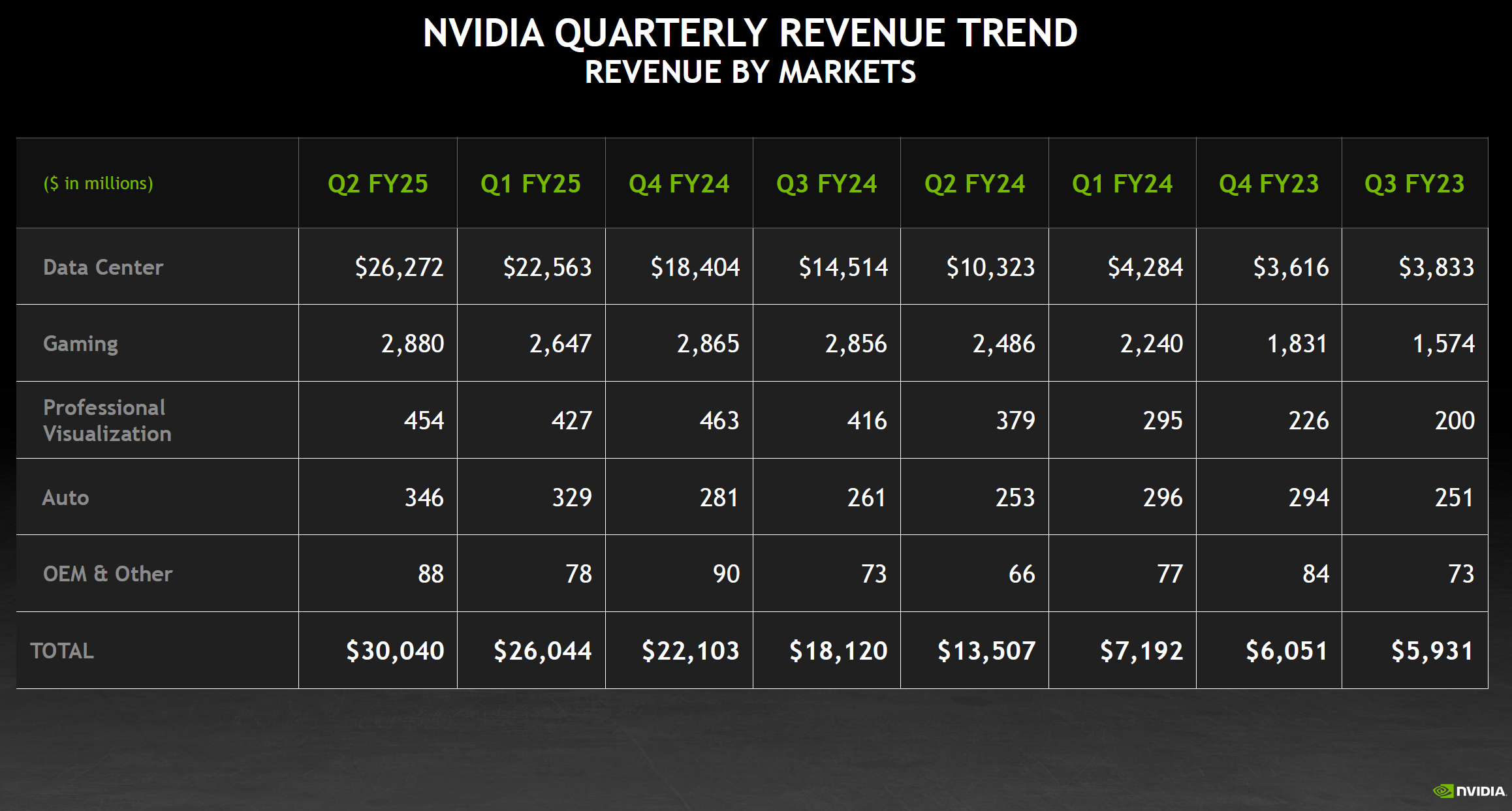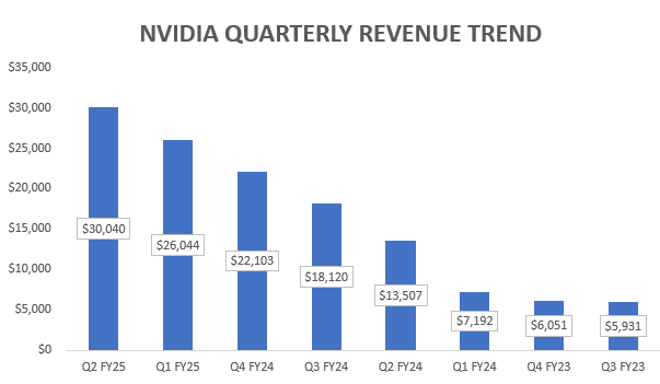 엔비디아(NVIDIA)는 최근 2025 회계연도 2분기 실적을 발표하며, 또 한 번 놀라운 성과를 보여주었습니다. 이번 분기 동안 엔비디아는 총 매출 300억 달러를 기록하며, 전년 동기 대비 122%의 놀라운 성장을 이뤄냈습니다. 비슷한 기간 동안 순이익도 168% 상승해, 회사의 전반적인 재무 상태가 크게 개선되었음을 나타냈습니다. 이러한 성과는 주로 AI와 데이터 센터 시장에서의 강력한 수요에 의해 견인되었습니다.