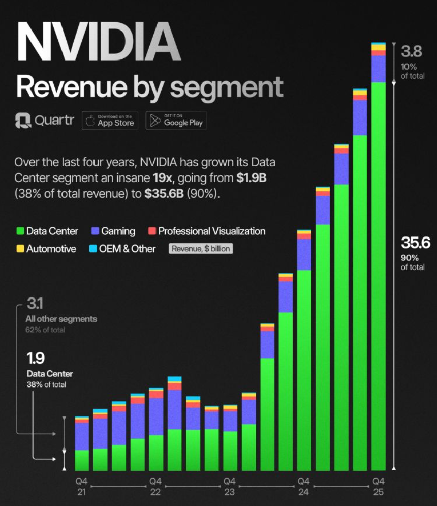 - 데이터 센터 매출: $35.6B (전 분기 대비 +16%, 전년 대비 +93%)