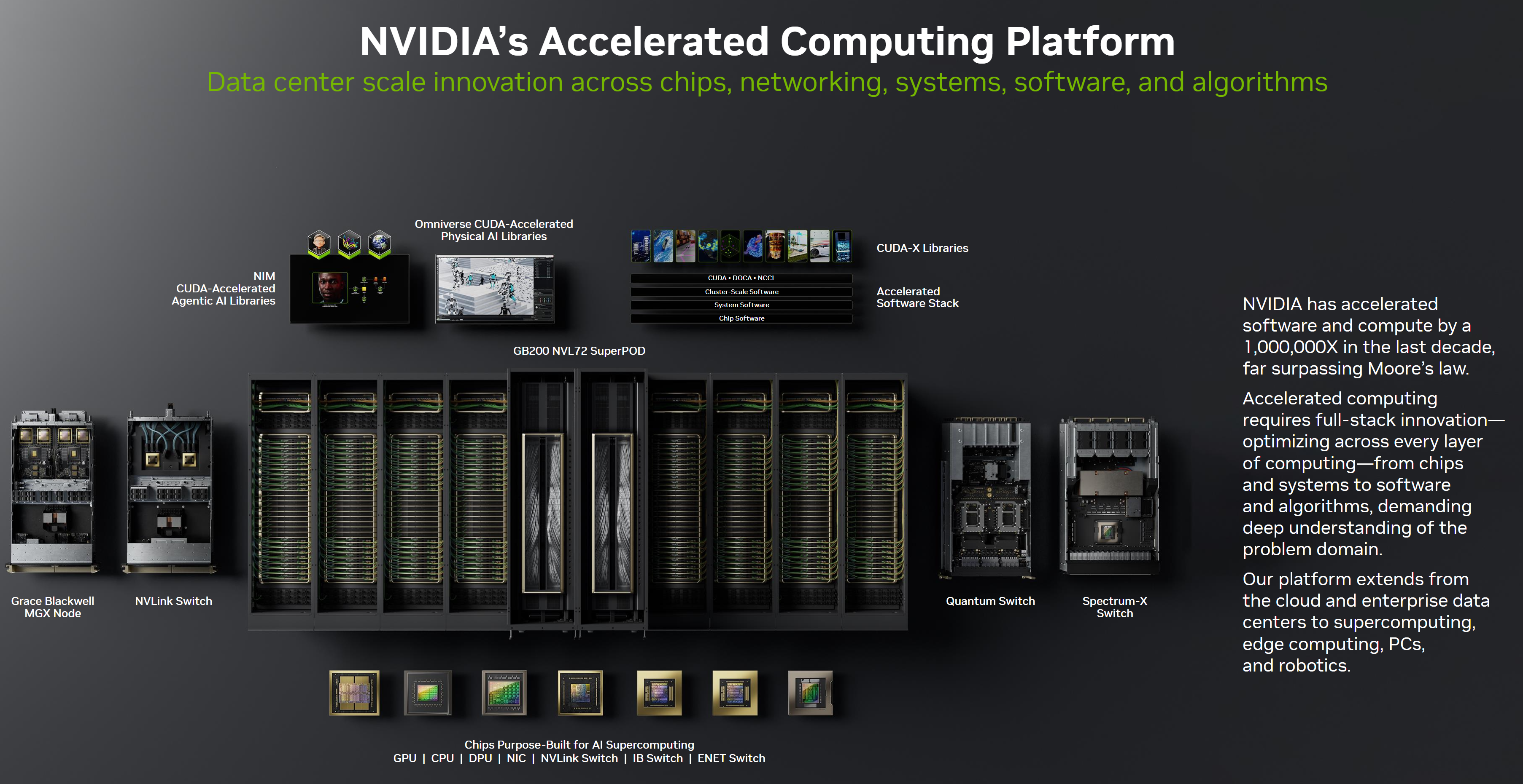 - NVLink 72, Quantum-2 InfiniBand 등 초고속 네트워킹 기술을 통해 AI 데이터 센터 최적화