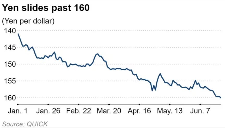 지난 수요일, 엔화가 달러 대비 160을 넘어섰습니다. 이는 정부와 일본은행이 통화 지원을 시작한 4월 말 이후 처음 있는 일로, 추가 개입에 대한 기대를 자아내고 있습니다. 이날 엔화는 한때 달러당 160.40엔까지 거래되었으며, 이는 1986년 12월 이후 최저 수준입니다.