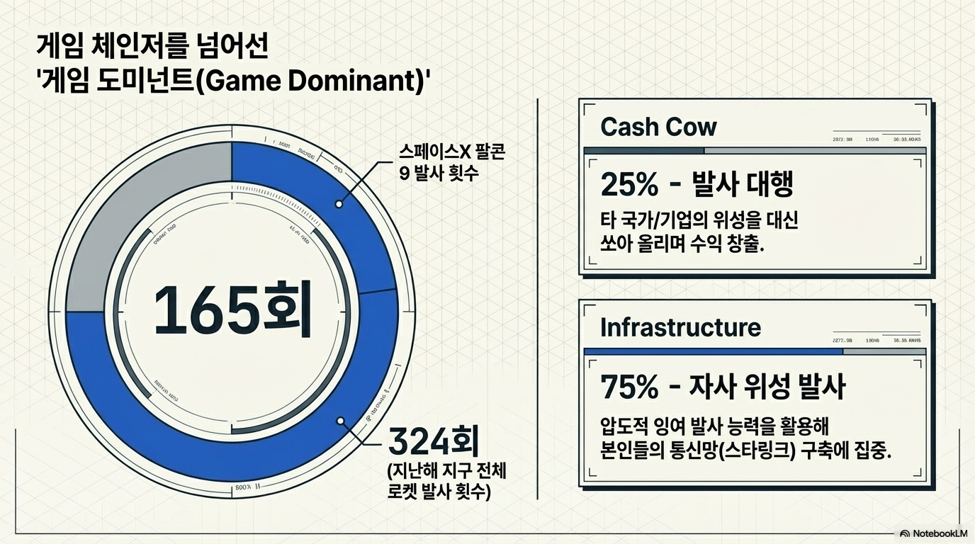스페이스X는 이제 시장의 룰을 바꾸는 수준을 넘어, 시장 그 자체가 된 **'게임 도미넌트(Dominant)'**입니다.