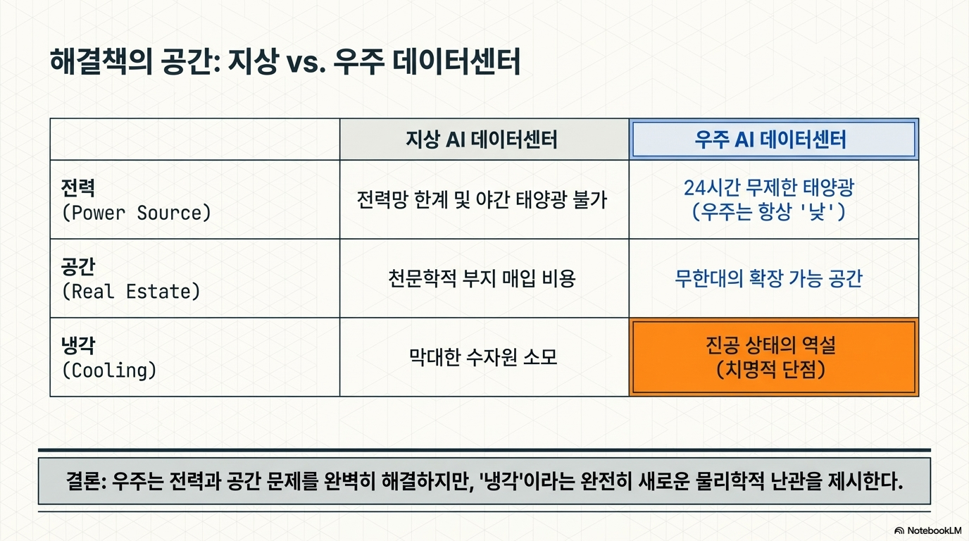 우주에 데이터 센터를 짓겠다는 아이디어는 매력적입니다. 24시간 내내 태양이 지지 않는 우주 공간에서 무제한의 태양광 전력을 얻을 수 있고, 지상의 비싼 부지 비용과 냉각 용수 문제를 단번에 해결할 수 있기 때문입니다.