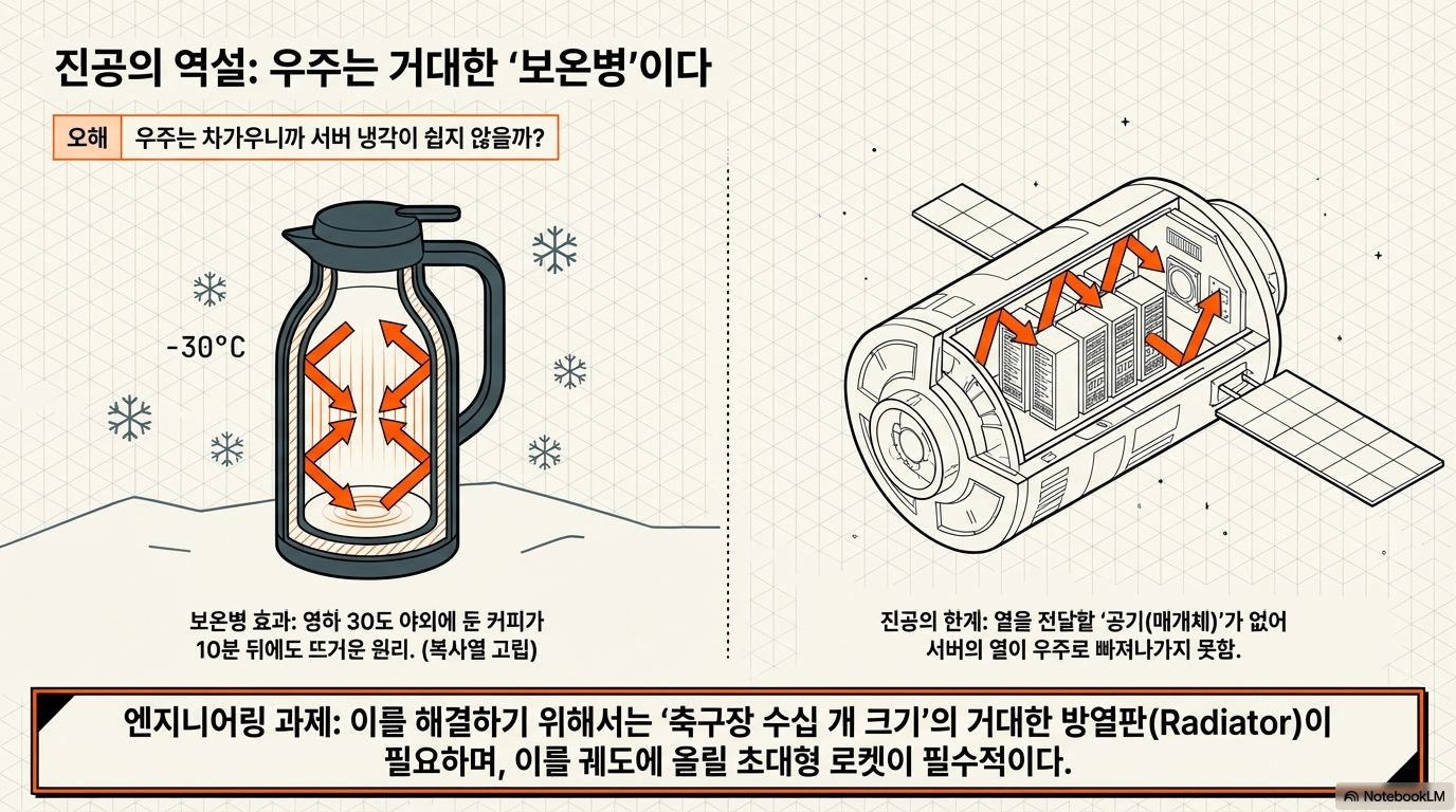 하지만 여기에는 **'복사열(Radiation)'**이라는 치명적인 기술적 난관이 존재합니다. 흔히 우주는 춥다고 생각하지만, 공기가 없는 진공 상태는 열이 빠져나가지 못하는 거대한 **'보온병'**과 같습니다.