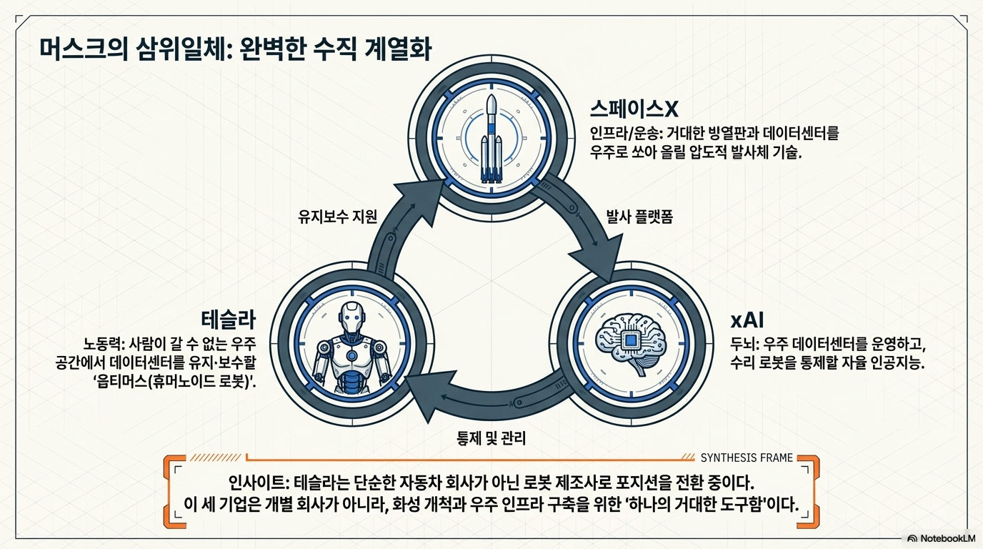 하지만 여기에는 비즈니스적 시너지라는 더 큰 그림이 숨어 있습니다. 바로 **xAI(논리/지능), 스페이스X(인프라/데이터 센터), 테슬라(하드웨어/휴머노이드)**를 잇는 이른바 '우주-AI 삼위일체'입니다. AI가 우주에서 학습하고, 스페이스X의 데이터 센터에 거주하며, 테슬라의 옵티머스(휴머노이드)가 이를 수리하는 완결된 생태계를 꿈꾸는 것이죠.