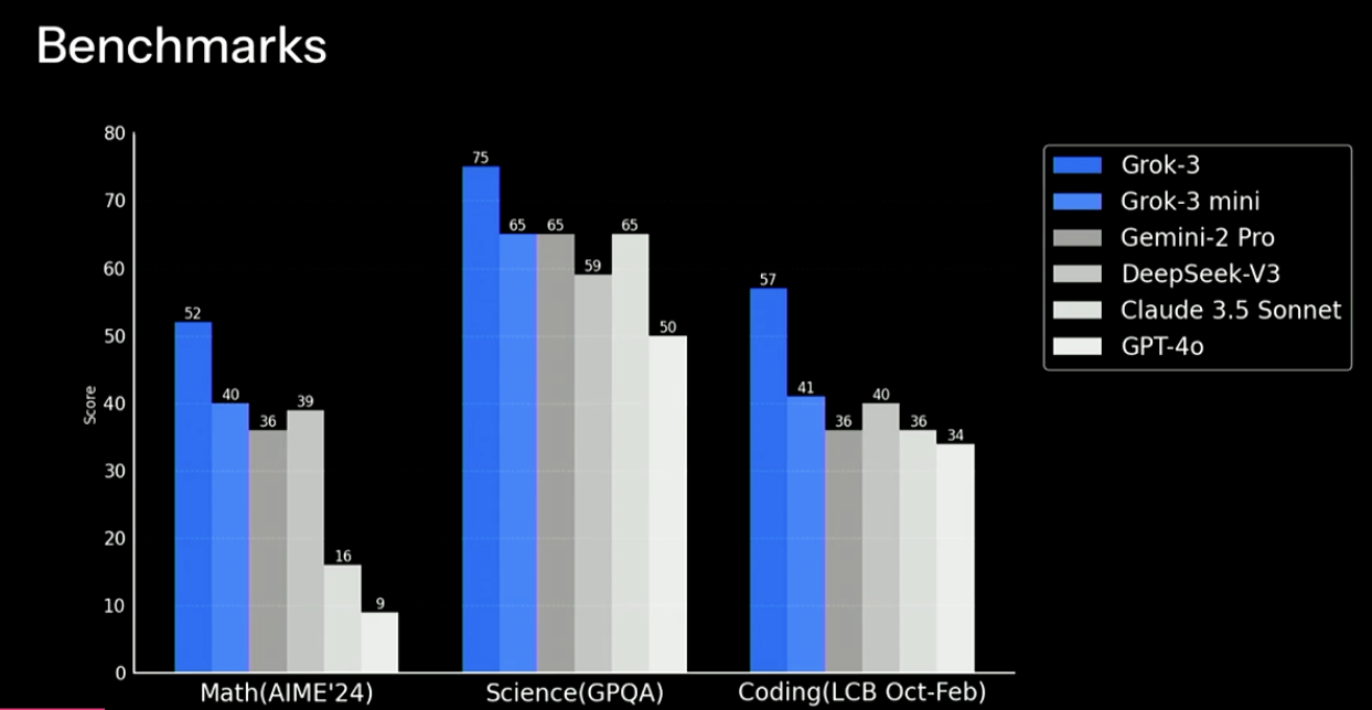 - 성능(Performance): Grok 3는 AIME 2025, GPQA 벤치마크 테스트에서 GPT-4o를 능가하며 강력한 성능을 입증