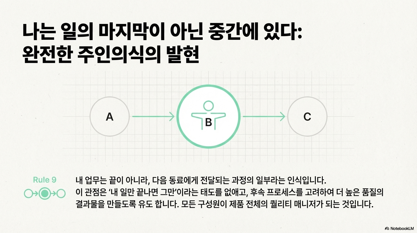“9시 1분은 9시가 아니다”라는 문장은 시간을 엄격하게 통제하자는 말이 아니라, 모두가 동일한 기준 위에서 일하기 위한 최소 합의를 요구합니다. 이 기준이 지켜지는 조직에서는