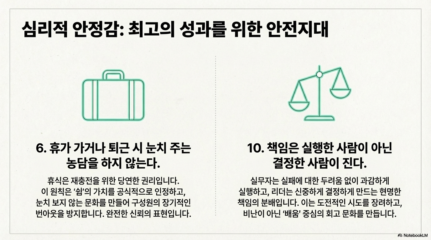 농담처럼 던지는 한마디가 실제로는 규범이 됩니다. “벌써 가?” 같은 말이 반복되면 휴가 사용률이 떨어지고 번아웃이 빨라지며, 장기적으로는 우수 인재 유지 비용이 폭증합니다. 이 원칙은 워라밸 구호가 아니라, 지속 가능한 생산성을 위한 운영 규칙입니다.