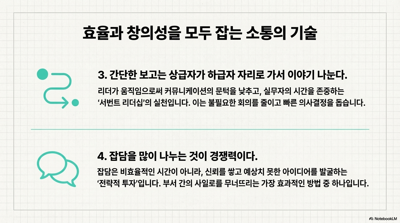 간단한 공유를 위해 하급자를 호출하는 문화는 생각보다 큰 비용을 만듭니다. 자리 이동, 대기, 긴장감이 붙으면서 **보고가 ‘업무’가 아니라 ‘의식’**이 되기 쉽습니다. 상급자가 먼저 다가가면 보고는 짧아지고 사실 중심이 되며, 무엇보다 **현장의 맥락(화면·자료·진행상황)**을 더 정확히 이해할 수 있습니다.