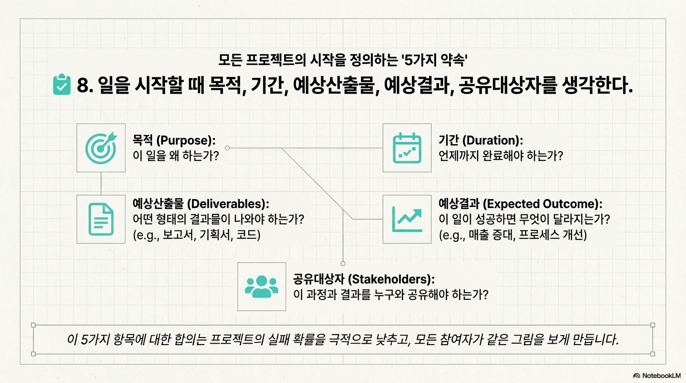 이 원칙이 제시하는 다섯 가지는 프로젝트 관리 기법이 아니라 오해를 사전에 제거하는 질문 목록입니다.